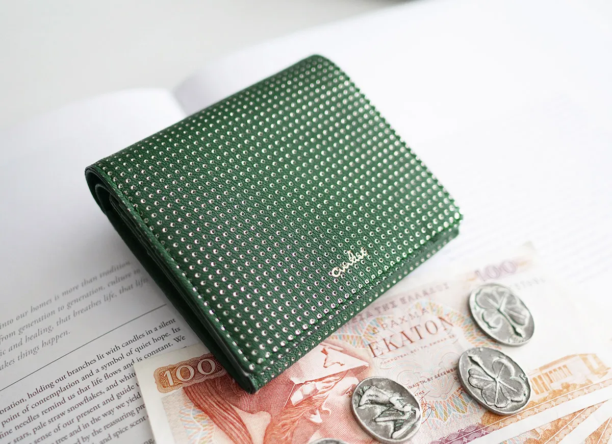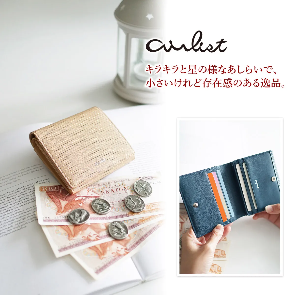 アイヌ語で美しいという意味。やわらかな山羊革に押した箔のドットが角度によって強くなったり儚くなったり…。美しくゆれる光が、星の瞬きにも似て、やさしく女性らしい気持ちにさせてくれます。軽さ、柔らかさが特長であるゴート(山羊革)を使用することでしなやかですっきりとしたお財布に仕上がっています。 少しスモーキーで、ロマンティックなカラーリング。型押しと同時に箔押しをすることで、パンチングしたような立体感のあるピンドットに仕上げられています。 薄くてコンパクト、毎日の持ち運びに最適なサイズ感の二つ折りウォレット。収納機能をしっかり備えた、小さいけれど頼もしいアイテムです。角度により箔押しが上品にキラキラ光り、大人エレガントな雰囲気を漂わせます。