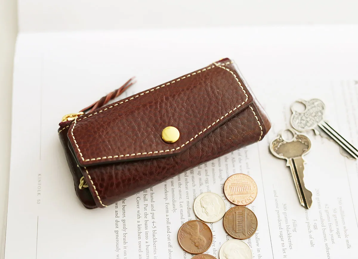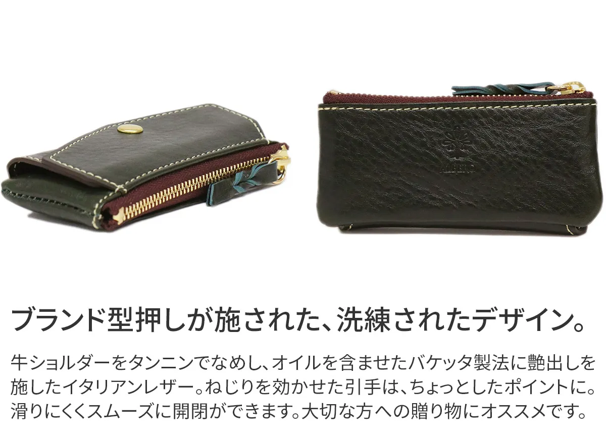 ハンティングキャップがモチーフ。ユニセックスラインBERRETTA。 牛ショルダーをタンニンでなめしオイルを含ませたバケッタ製法に艶出しを施した素材。 深みのある色合いに、滑らかなイタリアンレザーがしっくりと手に馴染む逸品。コンパクトでバッグやポケットにすっきりと収納ができます。小銭入れも備えられており実用的な仕様です。使う程にしなやかに変化し、艶の増すエイジングを楽しめます。