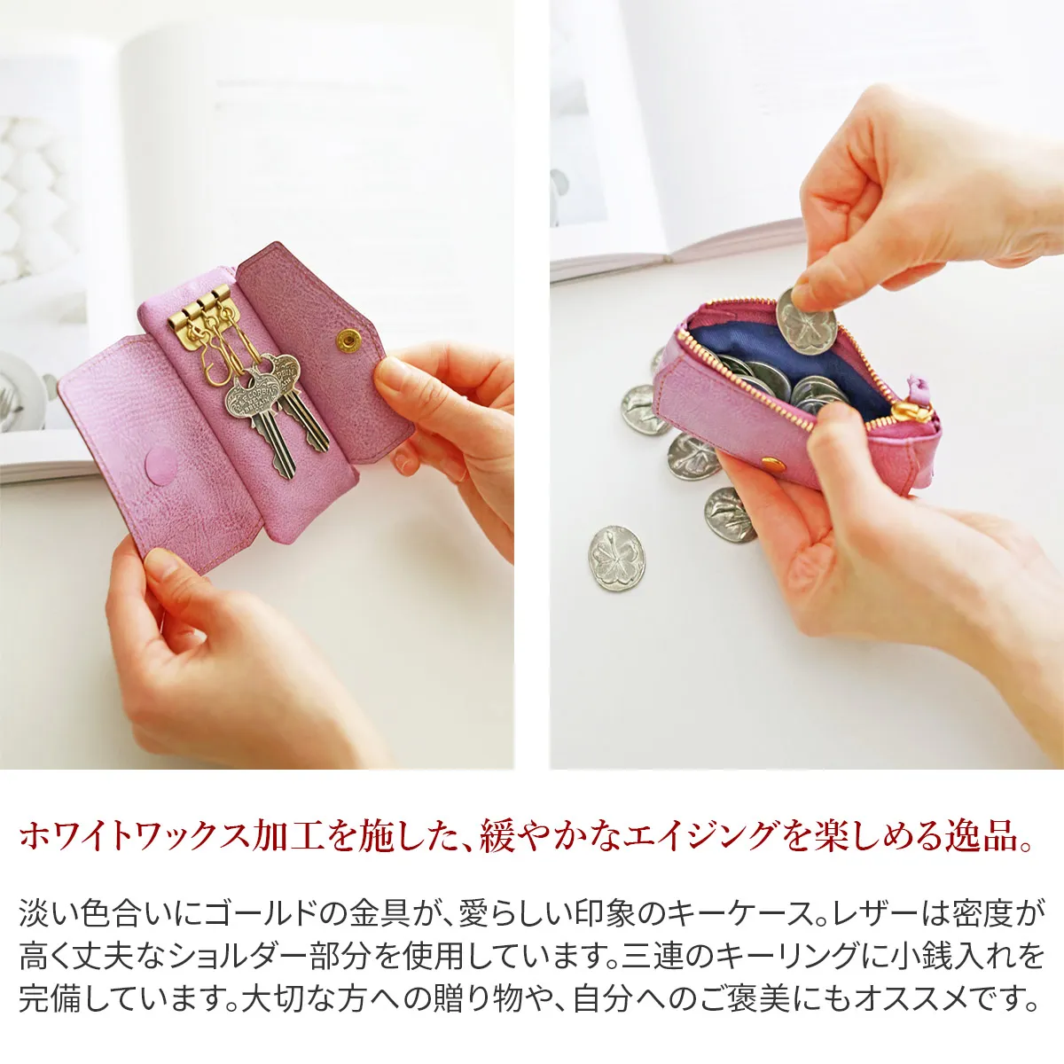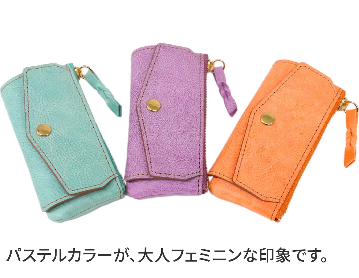 "MONTE BIANCO"白い山・モンブラン(伊)表は牛革ショルダー部分をタンニンで鞣し、柔らかくミルドしたレザーにホワイトワックス加工を施したイタリアンレザーを使用しています。 薄マチでバッグやポケットにすっきりと収納できるアイテムです。3連のキーリングに、小銭入れも備えられており機能的なデザインで使い勝手の良さが魅力的。ホワイトワックス加工を施した、シンプルなデザインに淡い色や濃淡を楽しめるアイテムです。