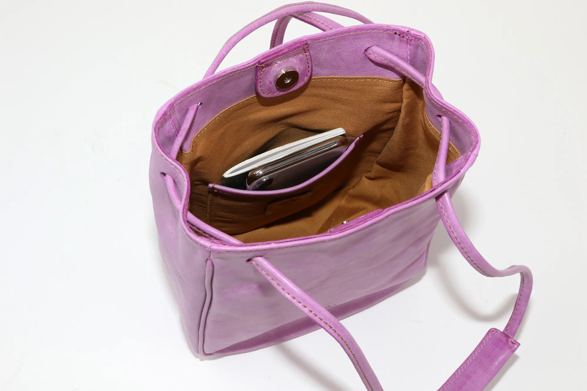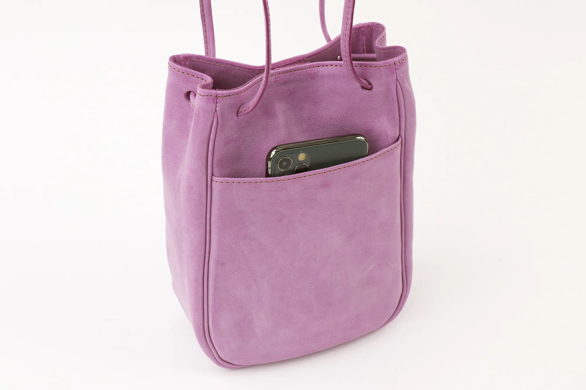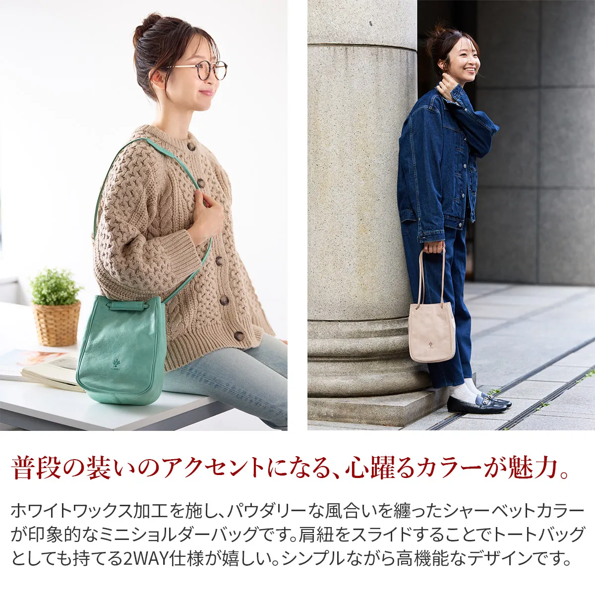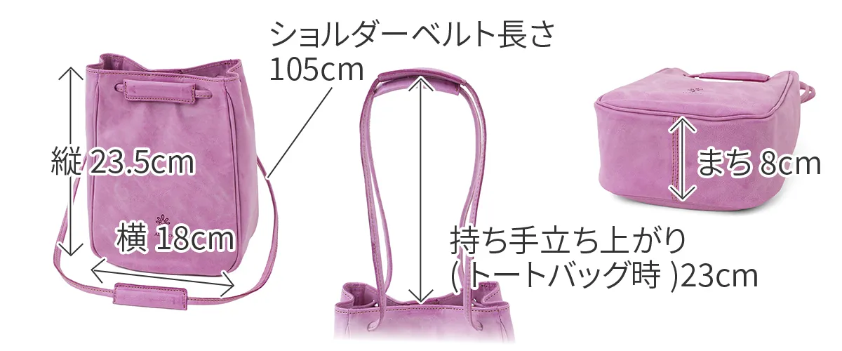 Wフェイスで表と裏の両面を楽しめる"MONTE BIANCO"白い山・モンブラン(伊) 表は牛革ショルダー部分をタンニンで鞣し、柔らかくミルドしたレザーにホワイトワックス加工を施したイタリアンレザーを使用しています。 スタイリッシュな縦長フォルムが目を引くミニショルダーバッグです。 パウダーを纏わせたようなふんわりとしたカラーリングが魅力でコーデのアクセントにも。 ショルダーベルトとしてはもちろん、サイドの結び目を引っ張るとトートバッグとしても使える2WAY仕様に。 肩に当たる部分には荷重を軽減してくれる、幅が広めの肩当てを備えています。 コンパクトなデザインながら長財布が縦向きでスッキリ収まるサイズ感で、休日のお出かけにぴったりなアイテムです。