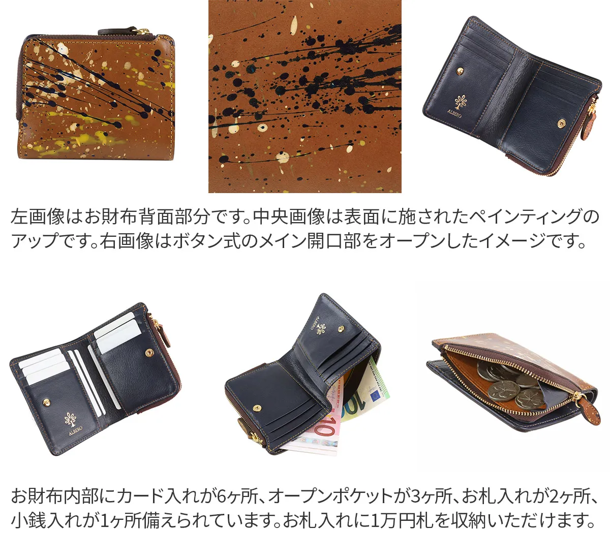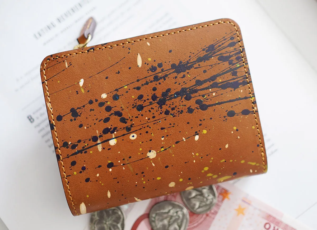 イタリアンショルダーのヌメ革に筆から塗料を飛ばしていくアクションペインティングが施されています。一点一点、唯一無二の抽象絵画のようなシリーズです。 一点一点違った仕上がりのペインティングデザインが印象的なアイテムです。小さいバッグやポケットにも収まりやすく、サブ財布としてもおすすめの逸品です。コンパクトながら収納力に優れており、使い勝手の良さも魅力です。