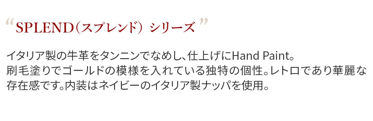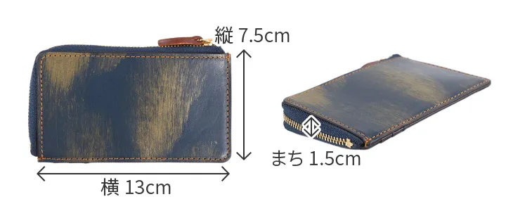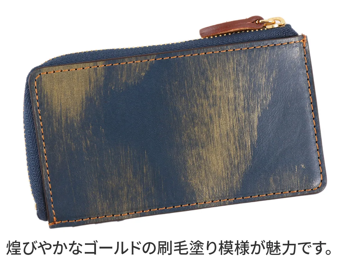 イタリア製の牛革をタンニンでなめし、仕上げにHand Paint。 刷毛塗りでゴールドの模様を入れている独特の個性。レトロであり華麗な存在感です。 内装はネイビーのイタリア製ナッパを使用。 ハンドメイドで施されたゴールドの刷毛塗り模様が印象的なミニマム財布です。小さなバッグにも収まりやすく、ミニマム派の方やキャッシュレス決済派の方におすすめ。サブ財布としてもお使いいただきやすい機能性抜群のアイテムです。