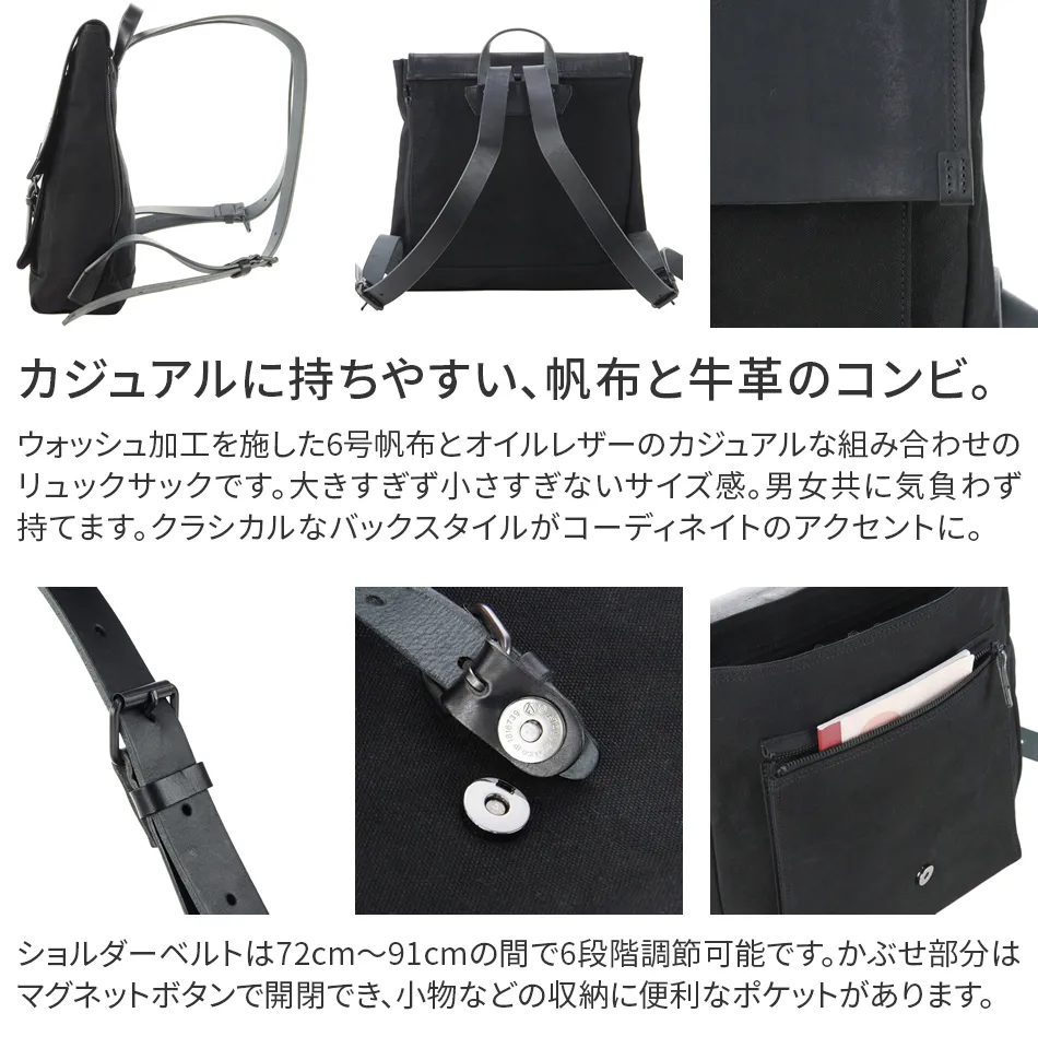 カジュアルスタイルにも相性の良い、6号帆布×牛革のコンビが人気のリュックサック。 大きすぎず小さすぎない使い勝手の良いサイズ感で、男女問わず幅広いシーンで大活躍します。 かぶせを留めるベルトは開閉しやすいマグネットボタン式、またバッグ内部へアクセスしやすいサイドファスナーを完備と、使い心地の良さにもこだわった機能美リュックです。