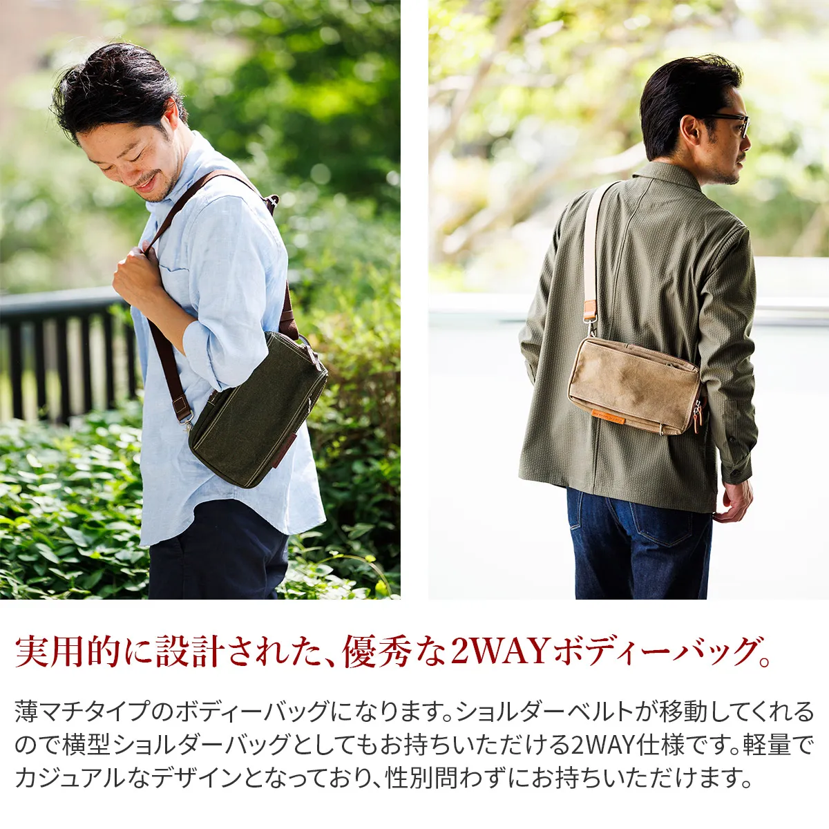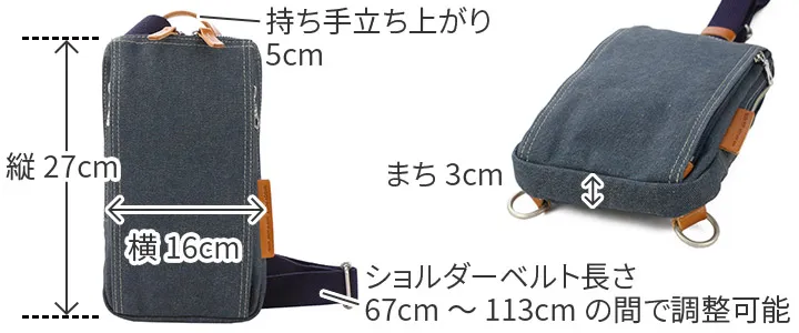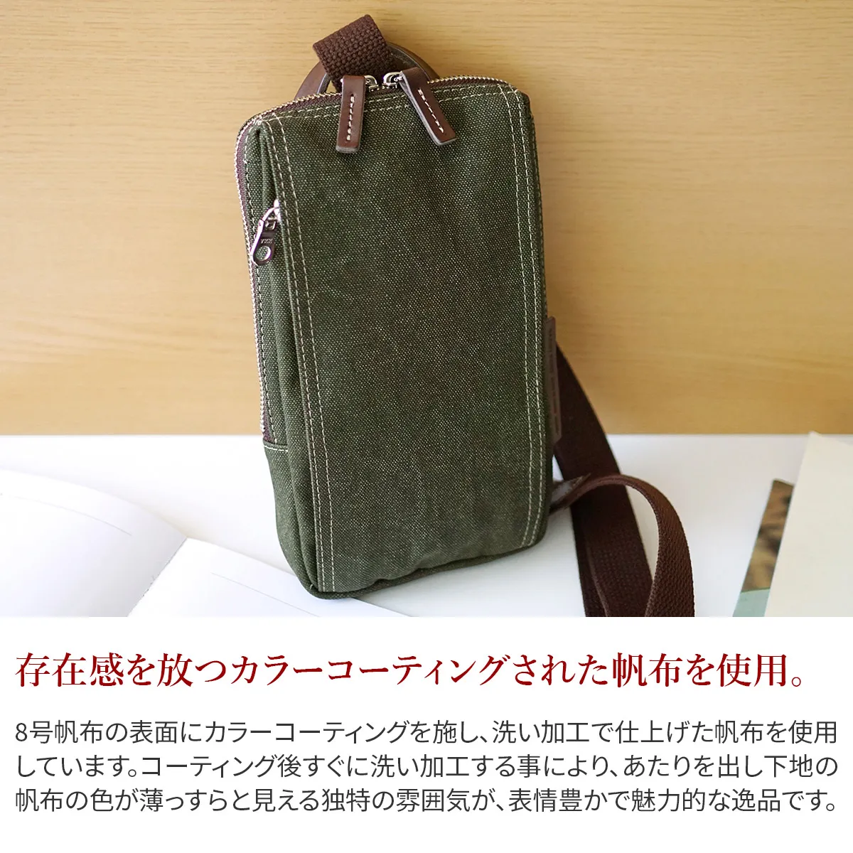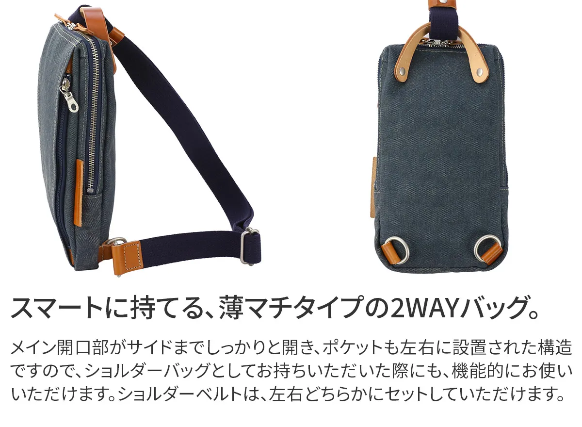 8号帆布の表面にカラーコーティングを施し、洗い加工で仕上げた帆布を使用しています。 コーティング後すぐに洗い加工する事により、あたりを出し下地の帆布の色が薄らと見える独特の雰囲気に仕上げています。 中作りは小分けで収納していただける構造になっており、ボタンを留めると目隠しになる仕様になっています。 スリムなマチ幅の縦型ボディーバッグになります。正面の両サイドにはファスナーポケットが設置されています。ファスナーが見えない様にデザインされており、シンプルかつスマートな外観となっています。ショルダーベルトが移動してくれるので横型ショルダーバッグとしてもお持ちいただける2WAY仕様です。横持ちの際は、正面のファスナーポケットを中心に出し入れがしやすい作りとなっています。機能性も兼ね備えた、カジュアルデザインとなっており、性別問わずにお持ちいただけます。軽量なのでアクティブなシーンにも活躍してくれます。