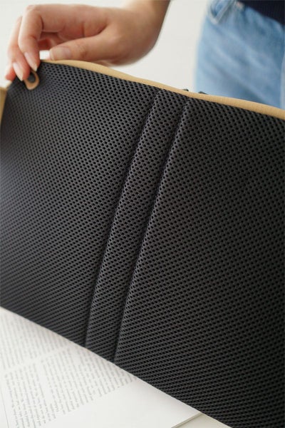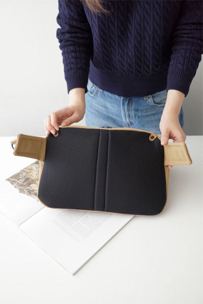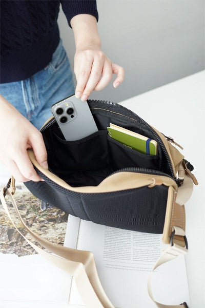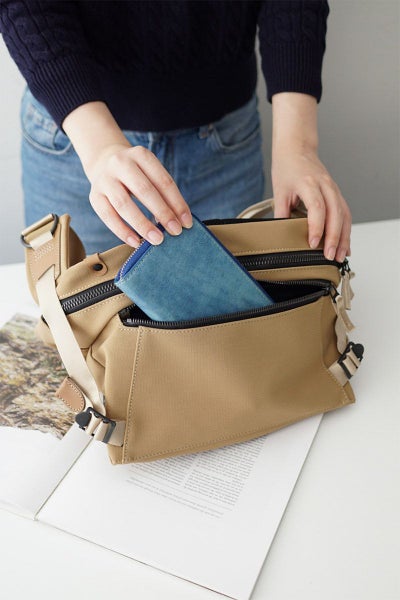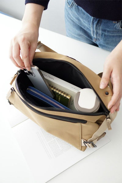 三層構造に加工したTEIJIN社 MINOTECH クロスを使用しています。高い撥水性を備えた生地に、更に耐水性をプラスする加工を施すことで防水生地に仕上げています。繊維としてはポリエステルですが、コットンタッチの風合いでストレッチの効いた素材ですので体にもなじみやすくヘビーユーズにも耐えうる丈夫な素材です。ファスナーにはメタル調のビスロンファスナーを使用しており、高級感はありながらも開閉がスムーズなのが特徴です。 正面のポケットはマチ幅があり、荷物量が多い際には立体的にフォルムが変形します。前ポケットのサイドのベルトで拡張幅を調節できる仕様で荷物が少ない時はすっきりとした雰囲気でお持ちいただけます。背面側の内ポケットはクッション性があり、タブレットなども収納していただけます。