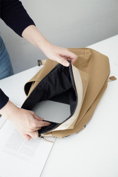三層構造に加工したTEIJIN社 MINOTECH クロスを使用しています。高い撥水性を備えた生地に、更に耐水性をプラスする加工を施すことで防水生地に仕上げています。繊維としてはポリエステルですが、コットンタッチの風合いでストレッチの効いた素材ですので体にもなじみやすくヘビーユーズにも耐えうる丈夫な素材です。ファスナーにはメタル調のビスロンファスナーを使用しており、高級感はありながらも開閉がスムーズなのが特徴です。 トップの開口部は立体的に取り付けられており、折り畳む様な仕様になっています。開口部はトップとサイドにあり、アクセスしやすい構造になっています。B4サイズ対応でありながらスマート感もあり、大人カジュアルな雰囲気でお持ちいただけます。キャリーオン機能付きで日常的な使用はもちろん出張やトラベルなどのシーンにも活躍してくれます。背面側の内ポケットはクッション性があり、タブレットなども収納していただけます。