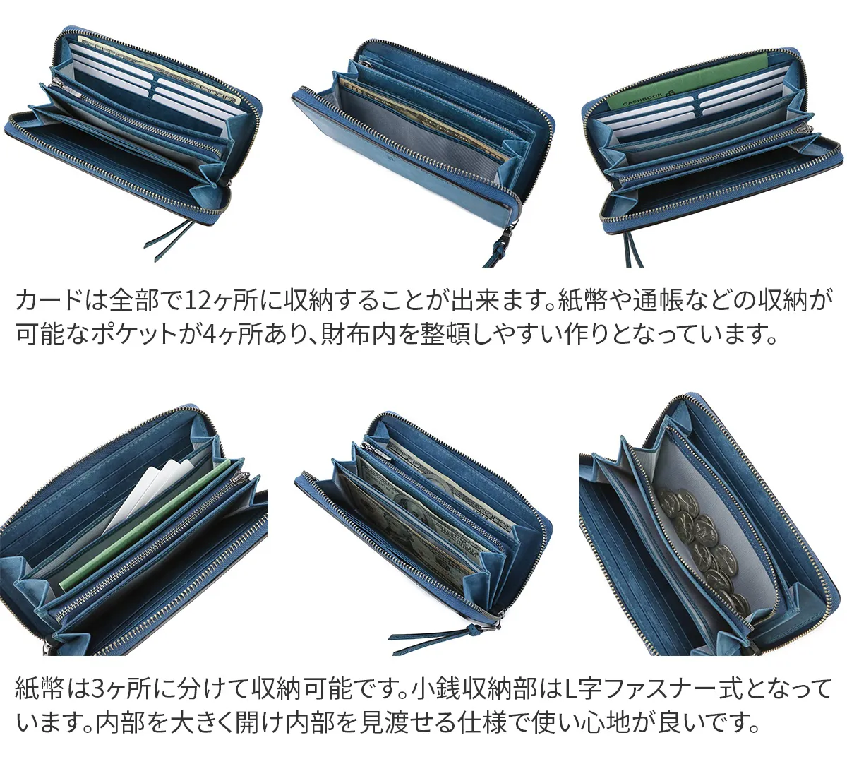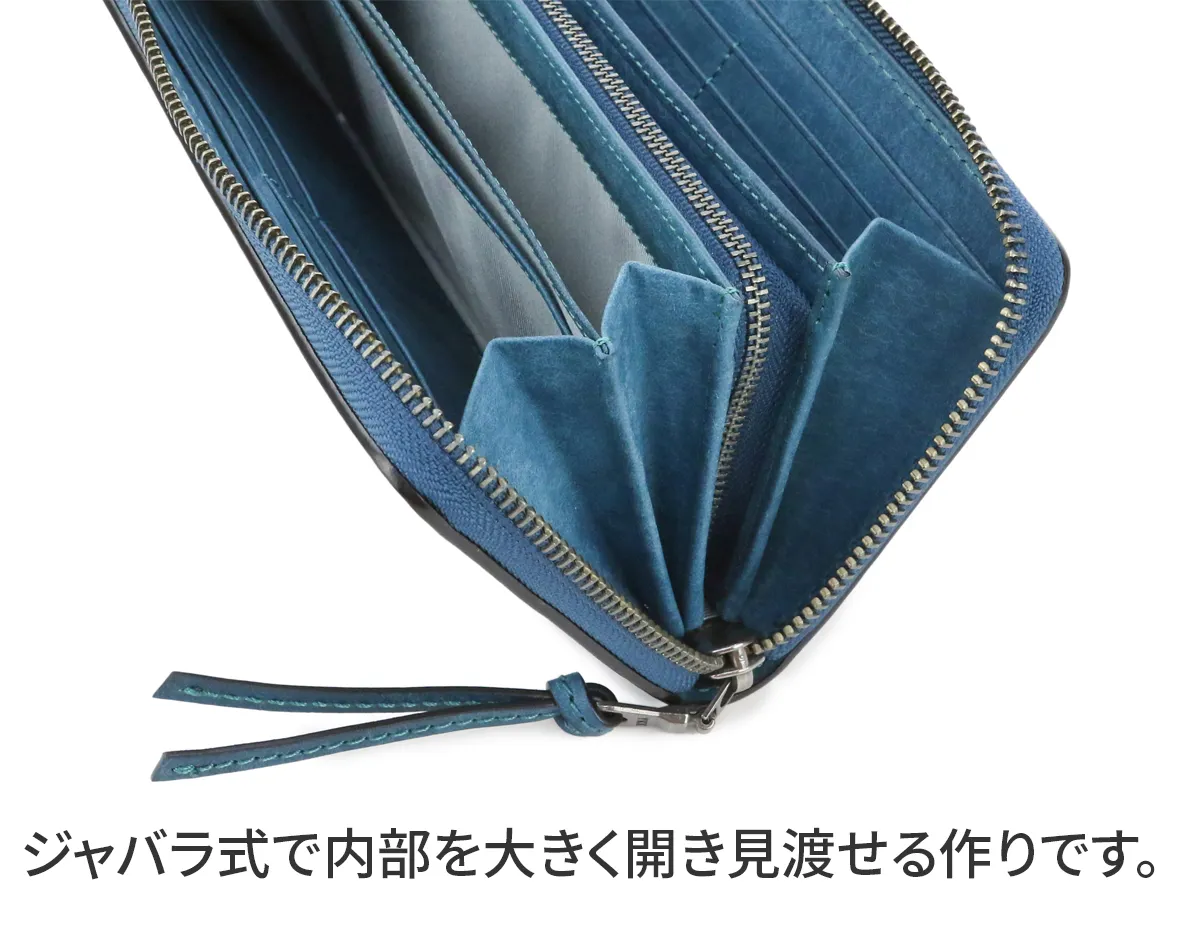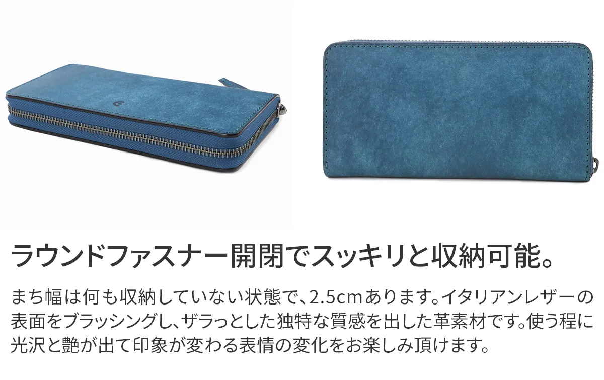 紙幣や小銭はもちろん、カードや通帳などたっぷりと収納し、コンパクトにまとめるラウンドファスナータイプの長財布です。シーンを選ばず持ちやすい上品でいて、どこか土臭い印象のレザー素材がこなれた大人の手元を演出します。中を大きく見渡せるジャバラ式の作りで使用感も抜群です。 イタリアンレザーの表面に、サンドペーパーをかけ、上から真鍮ブライで円を描くようにブラッシング加工を施した革素材です。使い始めは表面のザラッとした質感や土臭さ(暖かさ)が印象的な革ですが、使い込むにつれ光沢ととても美しい艶が出てきます。経年変化をお楽しみ頂ける味わい深い革で、コバ塗りで細部まで丁寧に仕上げられています。