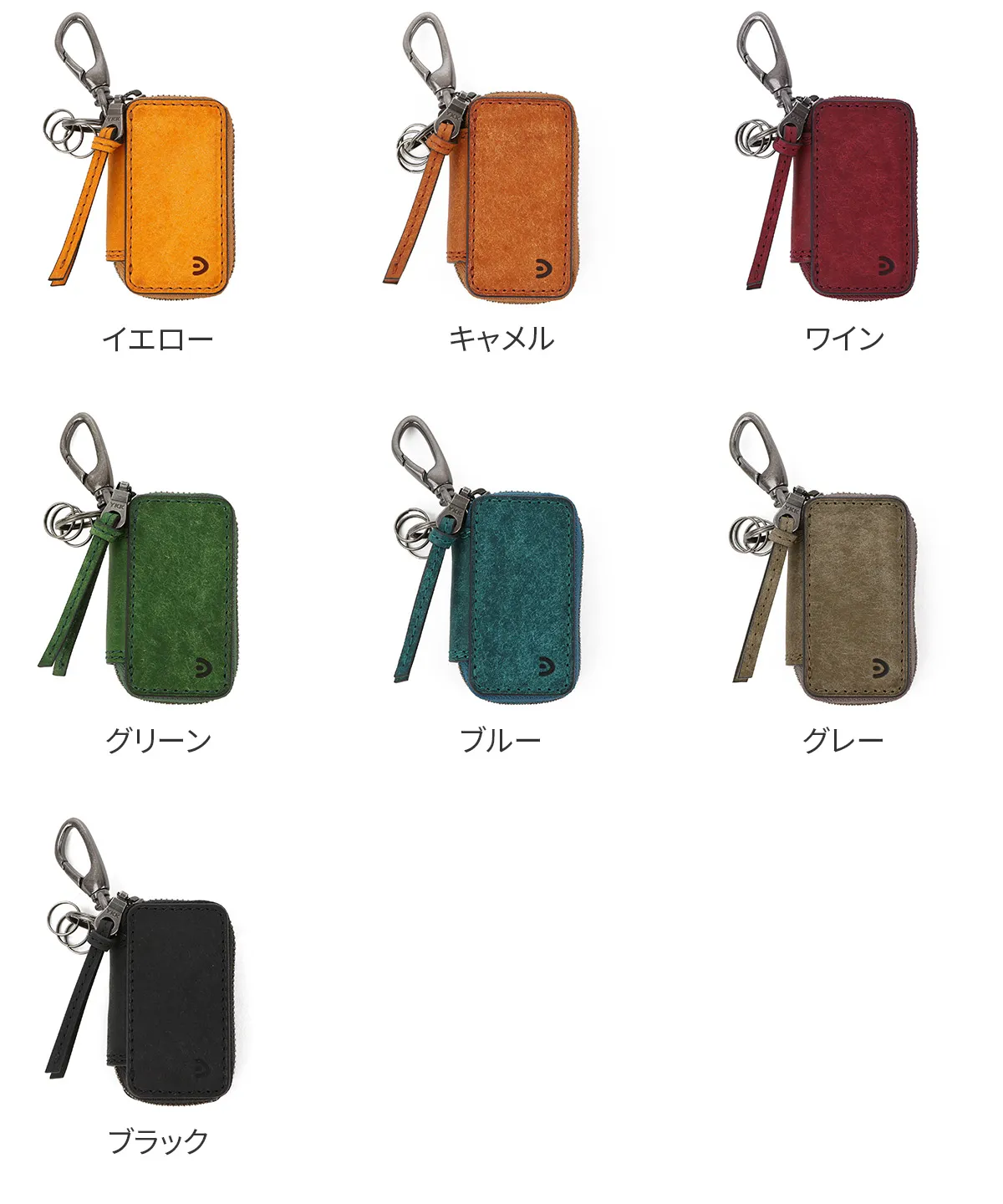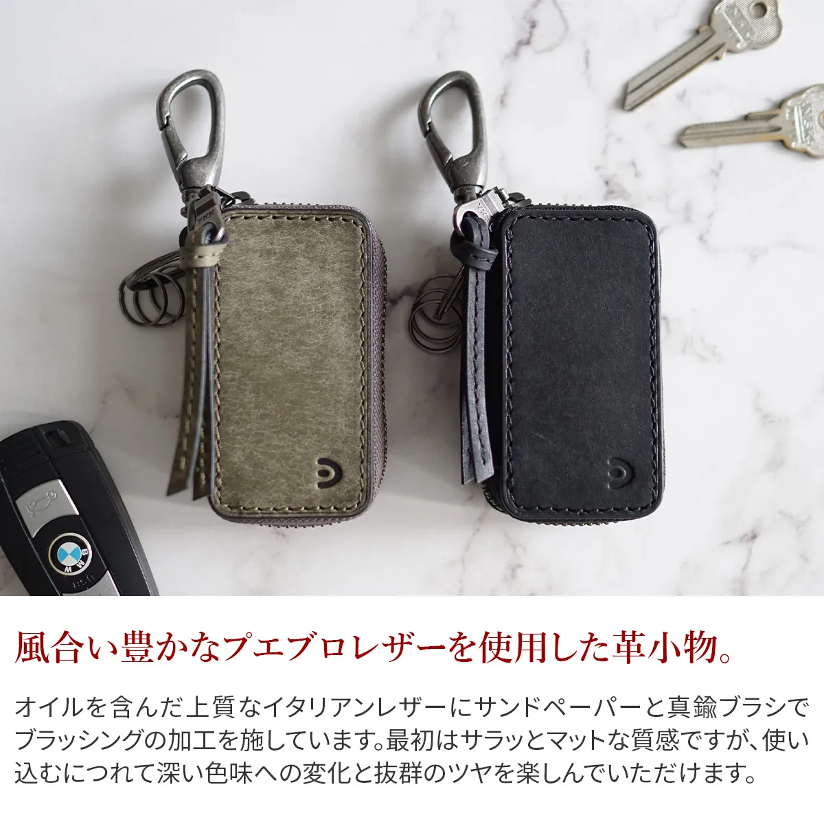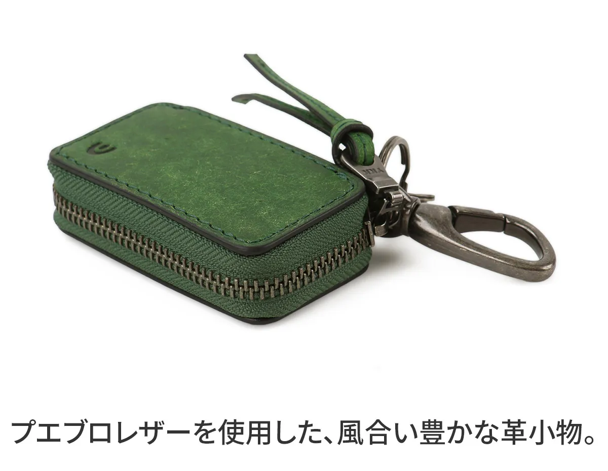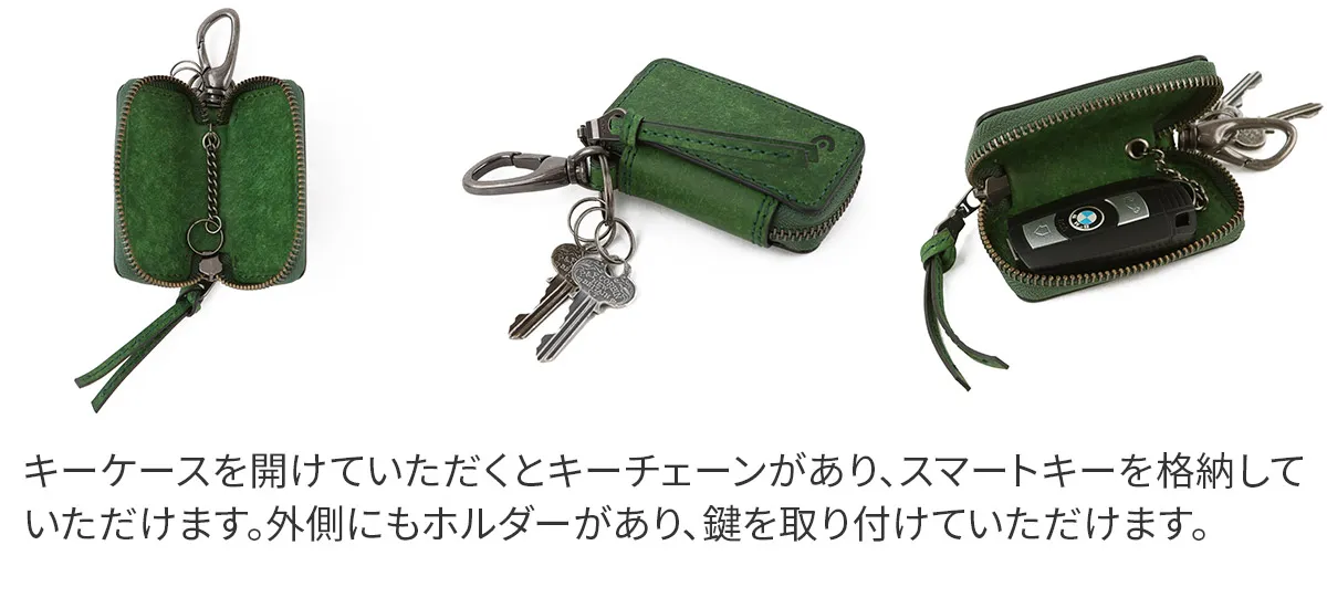 キーケースの中にチェーンが付いており、こちらにスマートキーを取り付ける仕様になっています。外側のリングには小さめの鍵を取り付けることも可能です。あまり出し入れする必要がないスマートキーは、革でしっかりとホールドされた構造になっており、外側の鍵と擦れることがない、安心感のある作りです。プエブロレザーは、経年変化を楽しめる素材で、ギフトにもお勧めです。 オイルを含んだ上質なイタリアンレザーにサンドペーパーと真鍮ブラシでブラッシングの加工を施しています。最初はサラッとマットな質感ですが、使い込むにつれて深い色味への変化と抜群のツヤを楽しんでいただけます。さらに、革全体に染み渡った油分によって、表面は驚くほどにしっとりとして手に馴染み、多少の水や乾燥からも革を守ってくれます。これは、牛脚油の主成分である「オレイン酸」による効果。オレイン酸は、お肌を乾燥から守ってくれる、人の皮脂に多く含まれている成分で、革にもよく馴染みます。オレイン酸は劣化に強く、乾燥もしにくいため、革の内側の適度な水分量を保ちながら、水分が抜けすぎて固くならないように保ち続けてくれます。 【プエブロレザー】 イタリアのトスカーナ州にある「バダラッシ・カルロ社」という世界的に有名なタンナー により、生後2年以上の雌牛の原皮のショルダー部分を使用しバケッタ製法で作られています。10世紀以上の歴史を持つイタリア伝統のバケッタ製法は、化学薬品を一切使用することなく、植物性タンニンにて鞣された牛革に時間をかけて純度の高い「牛脚油」を加脂していく製法です。