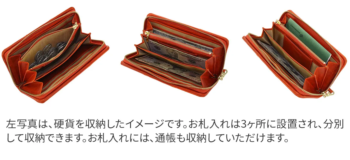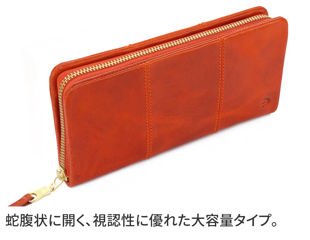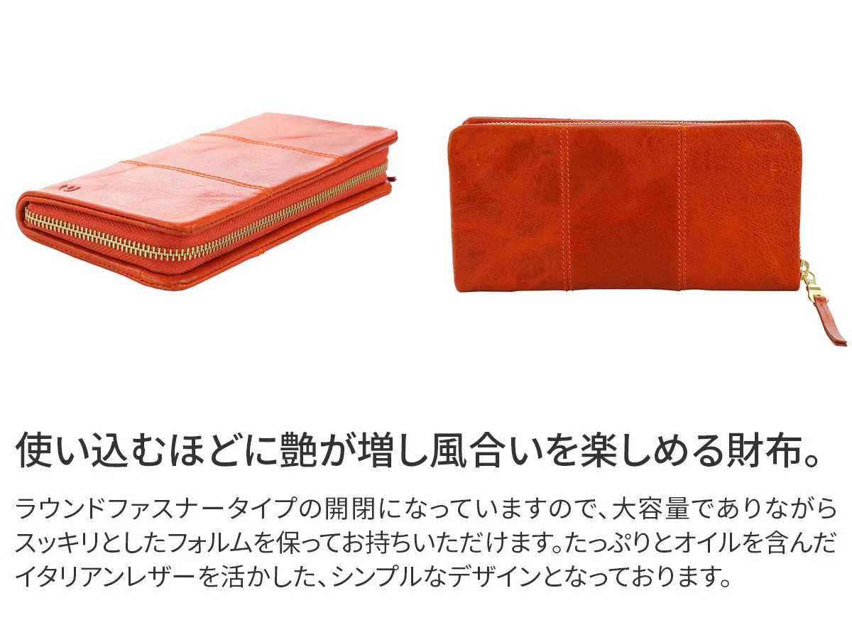 スマートなフォルムを保ってお持ちいただけるラウンドファスナー開閉の長財布です。カード収納も充実しており、通帳も入るので使い心地が良く、機能的です。お使いいただく時間の経過と共に光沢感が増して、その時々の風合いをお楽しみいただけます。 100%植物タンニンなめしの革に手染めと洗い加工を施した後、シュリンクのような型押し加工を施しています。表情豊かなイタリアンレザーは、洗い加工により柔らかい手触りに仕上げています。オイルがたっぷり染み込んでいるので、オイルが動いて白化するのが特徴です。使い込むうちに光沢が増し、経年変化が楽しめます。