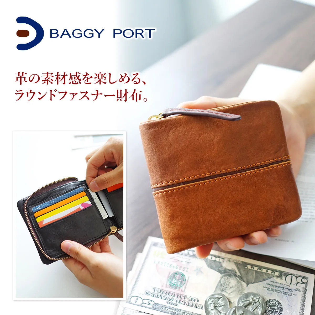 BAGGY PORT(バギーポート) フルクロームツートン ラウンド小銭入れ付き二つ折り財布 HRD-402 ふんわりとした印象のレザー 抜群の収納力も魅力