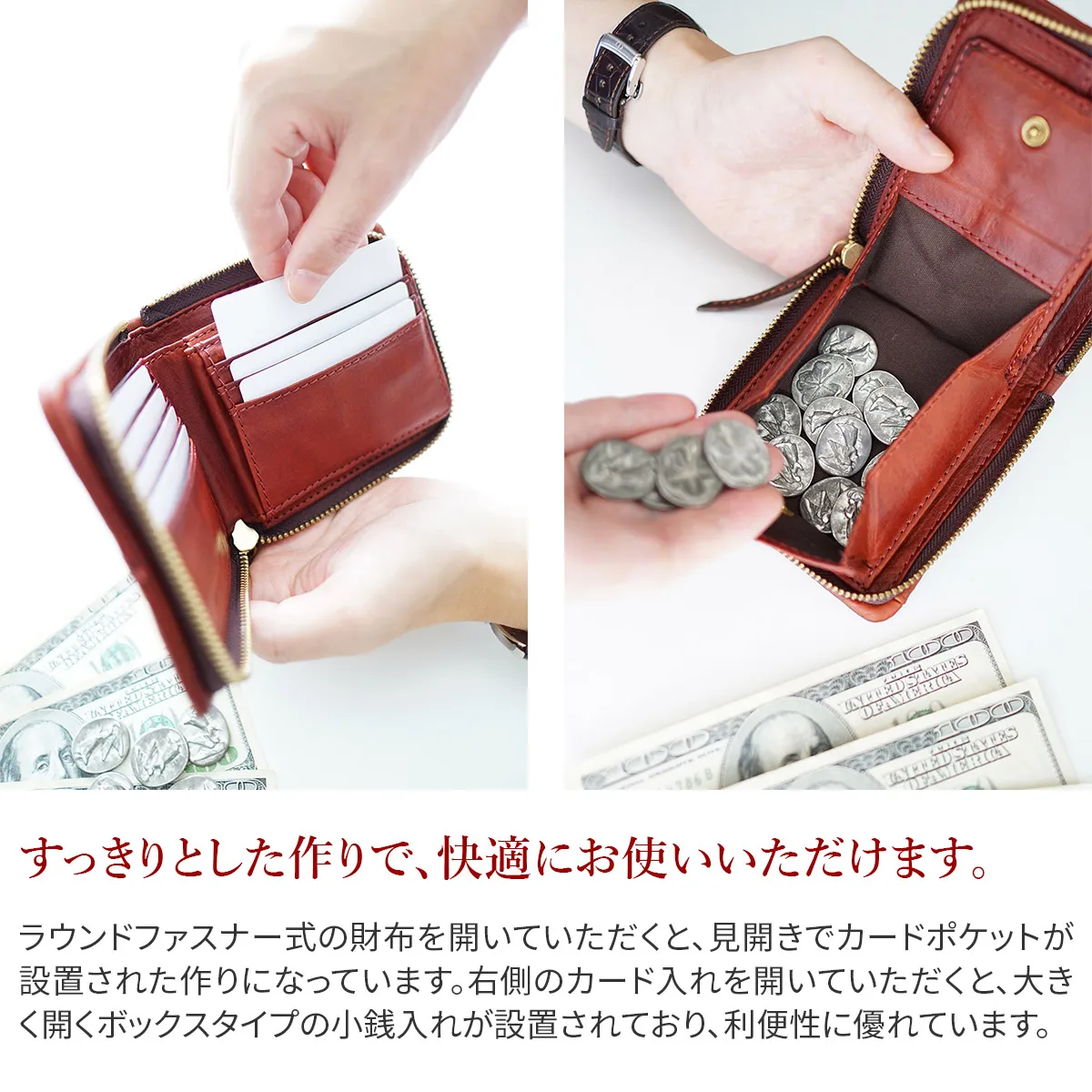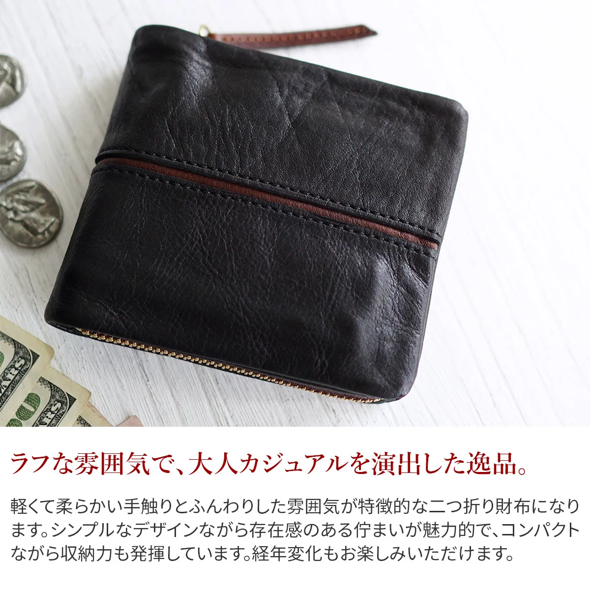 軽くて柔らかい手触りの牛革素材を使用しています。コンパクトなのに大きく開く小銭入れや、豊富に設置されたカードポケット等、充実した機能性が魅力的です。正面のラインがアクセントになったカジュアルなデザインで、普段使いにお勧めです。コンパクトながら収納力があり、利便性に優れたラウンドファスナー開閉の二つ折り財布です。