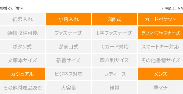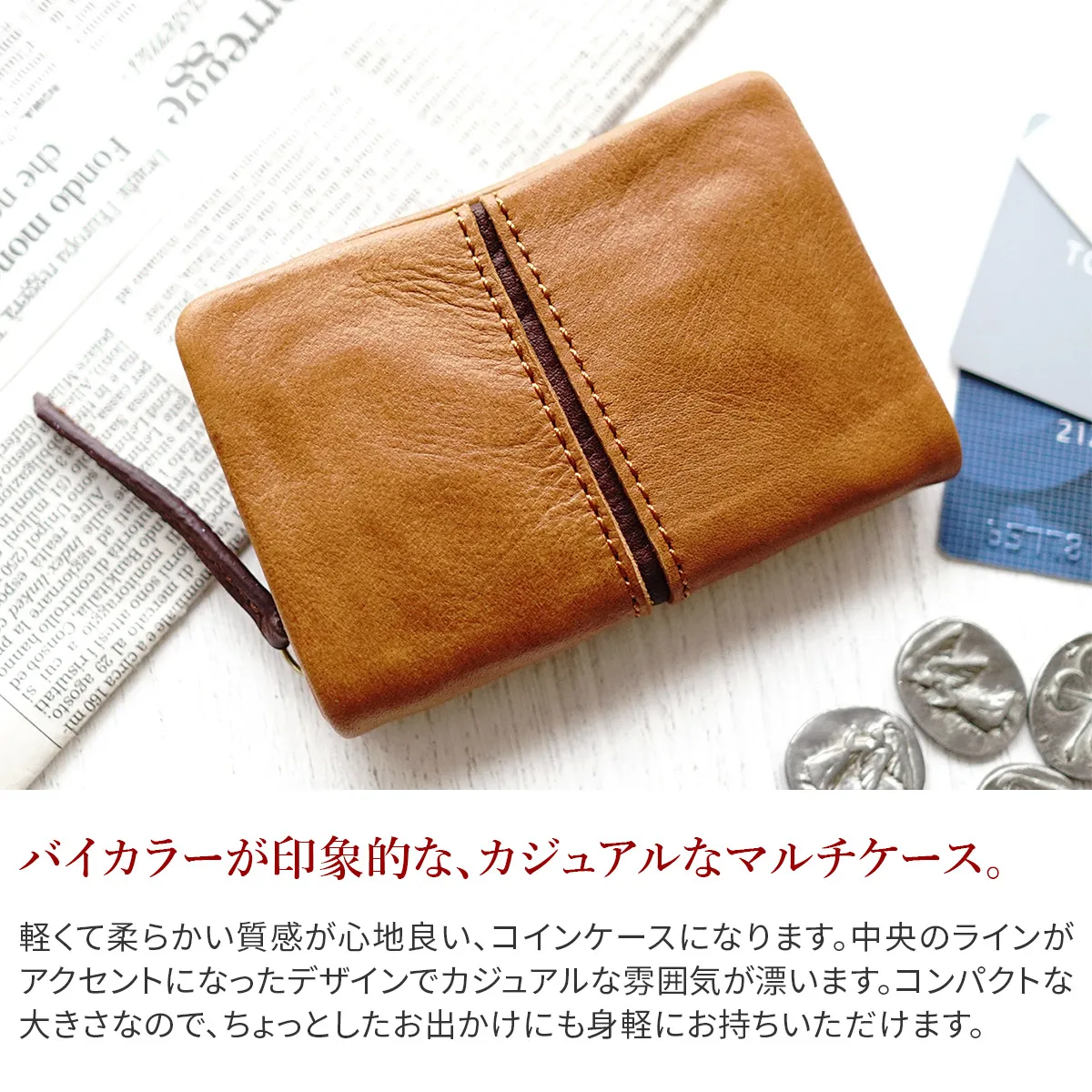 軽くて柔らかい手触りの牛革素材を使用しています。コンパクトながらしっかりと収納していただけるコインケースで、カード収納も可能な構造です。中央のラインがアクセントになったカジュアルなデザインで、普段持ちにお勧めです。同シリーズのお財布と併せて持つと統一感があり、大人のカジュアルスタイルを演出してくれる逸品です。