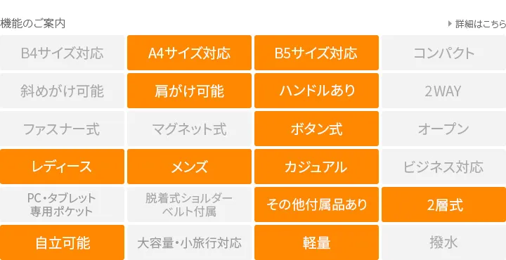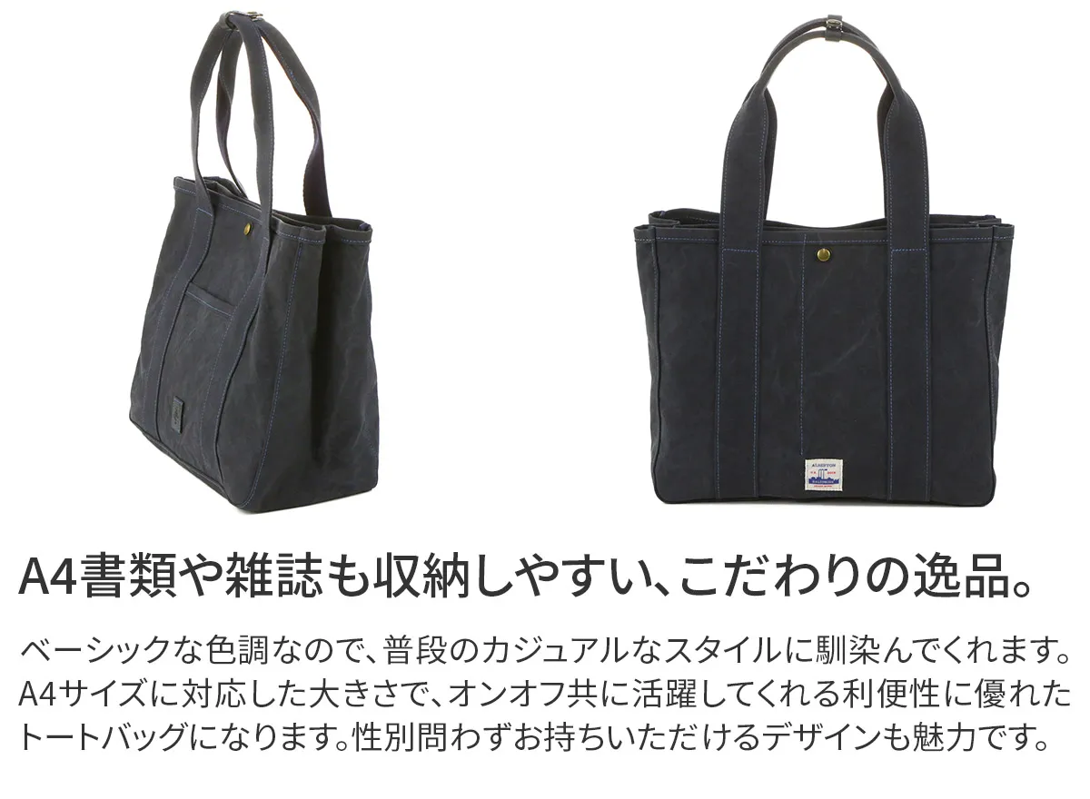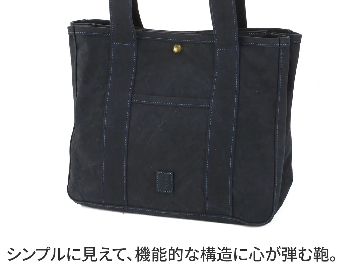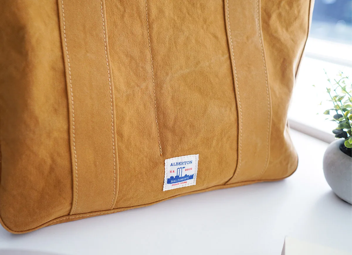 細い糸を使用して、織物の組織密度を上げたダックと呼ばれる平組織で織られた帆布を使用しています。 高密度で丈夫でありながら、軽やかな作りが特徴です。 シンプルでカジュアルな雰囲気のトートバッグになります。 メイン収納部は中央に仕切りが付いており、小分けできる縦の仕切りはボタンで自由に設置できる構造になっています。 3室にする事で、小さい荷物を綺麗に整理して収納していただけます。 中央に仕切りが設置されているので、横に広がらずフォルムを保ってお持ちいただけます。 性別問わずにお持ちいただける、ベーシックなデザインとなっております。 ALBERTON(アルバートン)社のダック生地を使用している証として、背面にはタグが縫い付けてあります。