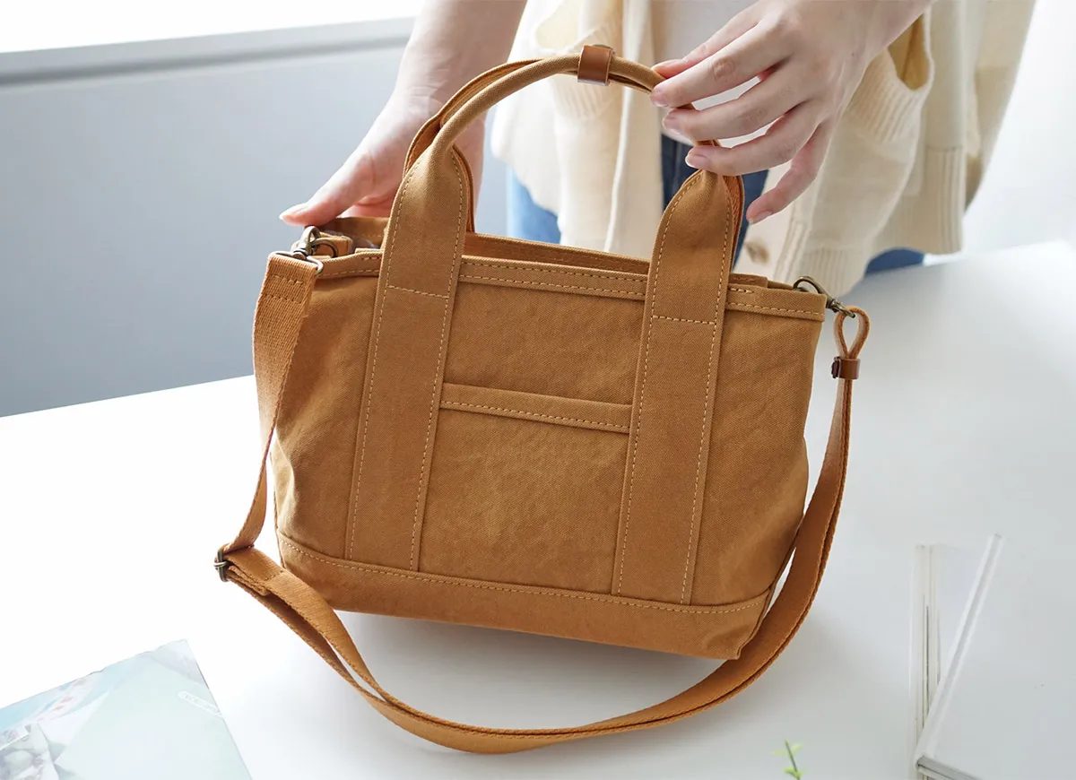 細い糸を使用し、織物の組織密度を上げたダックと呼ばれる平組織で織られた帆布を使用しています。高密度で丈夫でありながら、軽やかな作りが特徴です。 500mlのペットボトルも収納していただける、コンパクトな2WAYトートバッグ。中には、取り外し可能な仕切りポーチが備えられており、BAG in BAGとしてもお使いいただけます。仕切りは底に固定されていないので、荷物に合わせて動く自由度があるのが機能的です。とても軽量で普段使いに活躍してくれます。