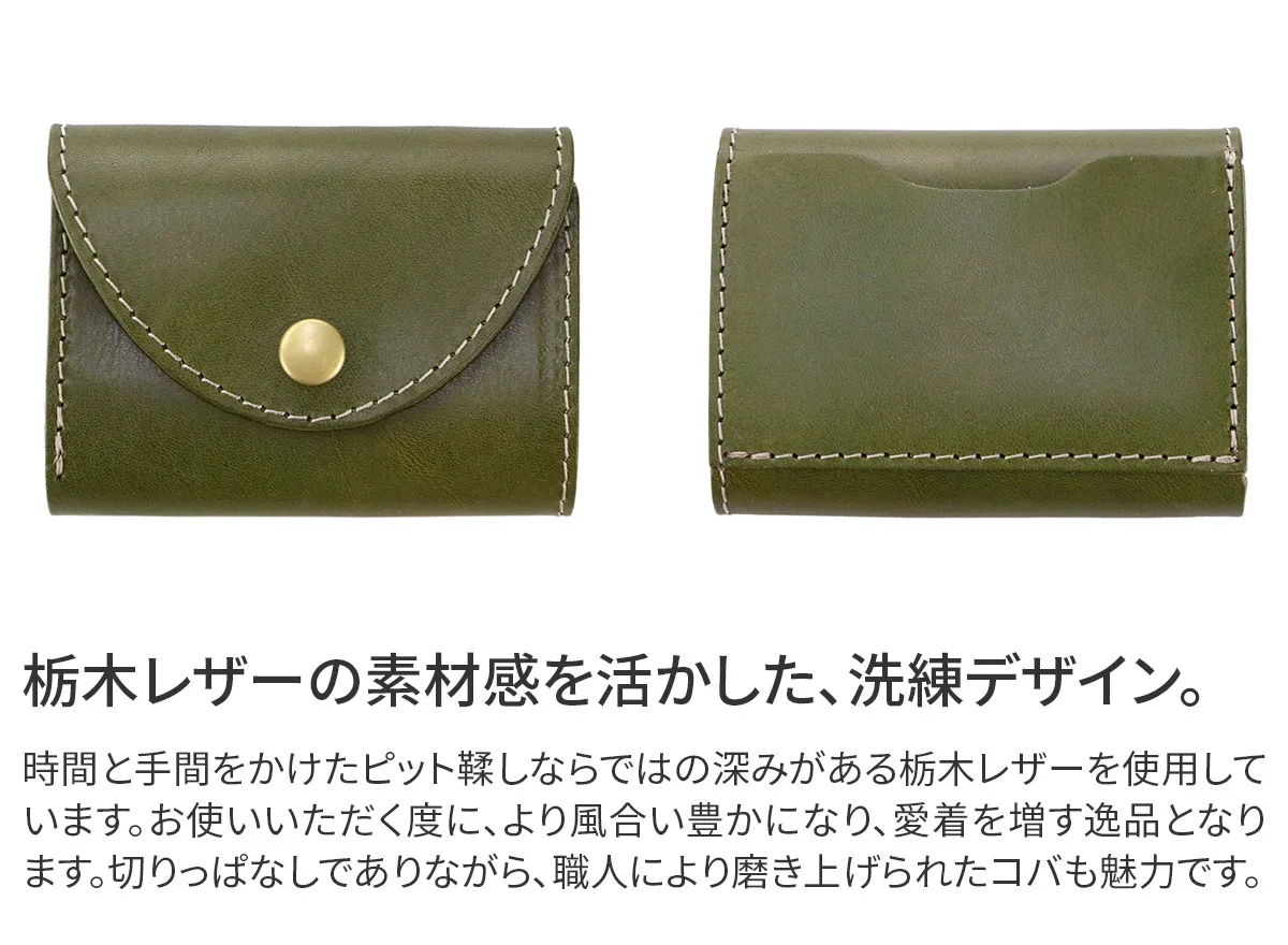 栃木レザーは、時間と手間をかけたピット鞣しならではの深みがあります。 お使いいただく時間の経過と共に、経年変化をお楽しみいただけ、愛着を増す素材となっております。 また、切りっぱなしでありながら、丁寧にひとつひとつ職人の手で磨き上げられたコバも魅力となっております。 小銭入れ付きの三つ折り財布で、シンプルな作りとコンパクトさが実用的です。 小さな鞄をお持ちいただく際の財布としてもお勧めです。