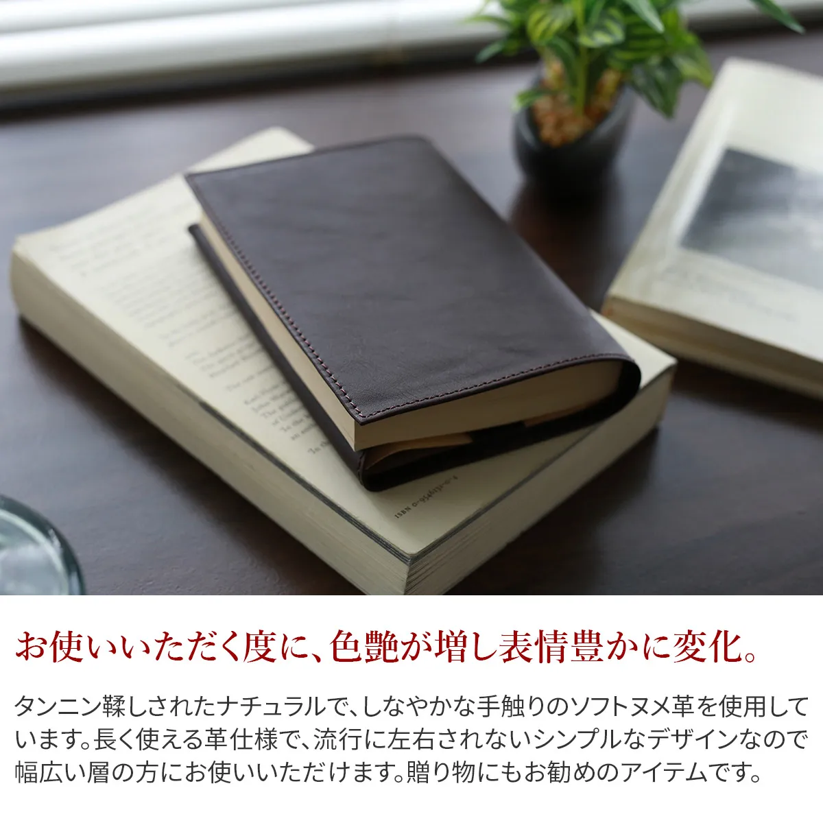 タンニン鞣しされたナチュラルで、しなやかな手触りのソフトヌメ革を使用しています。 読書の時間を上質なひとときにしてくれる、文庫本サイズのブックカバーです。本の厚みに応じて、カバーを折り返してセットするので本にフィットしやすくなっています。豊富なカラーバリエーションで、読書好きなあの人へのプレゼントにも最適です。読んだ数だけ手に馴染む経年変化を是非楽しんでください。