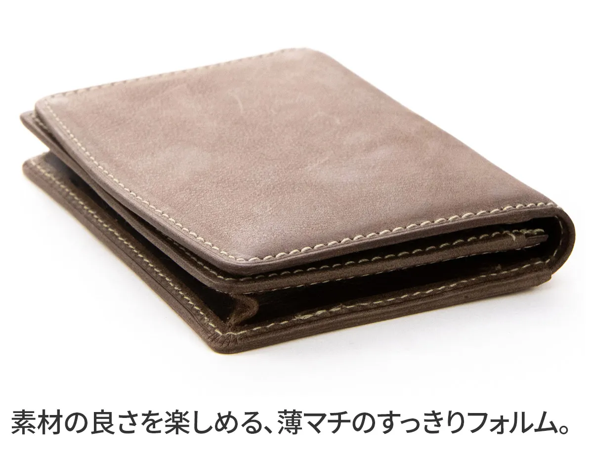 スーツスタイルにもデニムスタイルにも合う、紳士の名刺入れ・カードケース。随所に、日本の熟練職人による手仕事の緻密さを感じることが出来る作りです。名刺入れとしての用途に限らず、クレジットカードサイズであれば電子マネーカード、交通系カード、免許証も収納できます。畳んだお札、おみくじなどを入れても良いでしょう。これからは、こんな使い方も出来ます。 本体の皮革は、銀面を軽く擦り、染色とほどよいオイル加工で牛革の色や腰を ソフトに落ち着かせ、摩擦による焦がしの効果が出やすいワックス加工を施しています。素朴な雰囲気の皮革に合わせ綿糸風のスパン糸で縫製することで、デニムジーンズの糸への色移りのような表情を出しているため、どこか暖かみを感じるような仕上がりも魅力的。