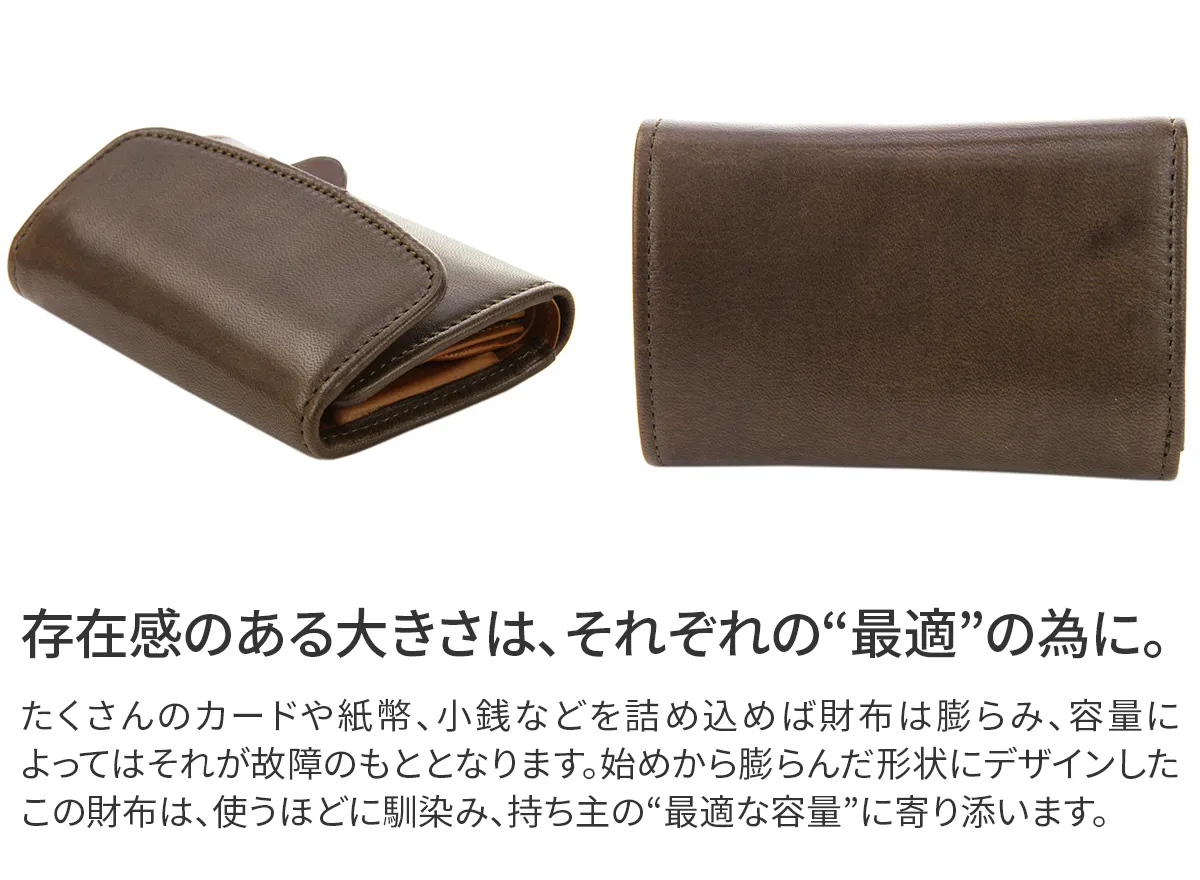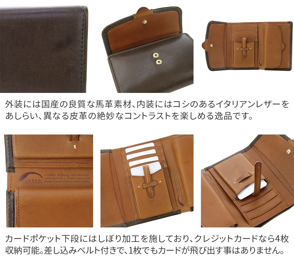CORBO.(コルボ) -Bottom Horse- ボトム ホース 小銭入れ付き三つ折り財布 8LE-9406 国産の馬革とイタリアンレザーのコンビ。 非常に贅沢な作り込みと機能美を併せ持つ三折り財布。