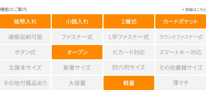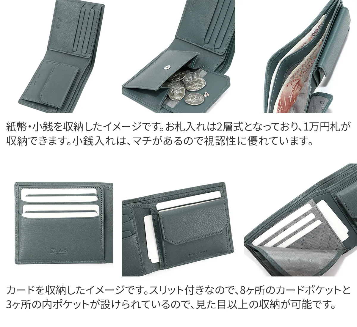 日本の職人が手掛ける、繊細な技術を取り入れたシリーズ。 カード段のラインや風琴マチなど、伝統的な技法を用いることで、機能性の高さと見た目の美しさを兼ね備えています。 しなやかで軽いタッチ感と透明感のある色合いが特徴で、日常での優美さを演出するアイテムです。 使い心地の良いシンプルな設計で長く使いたくなる二つ折り財布。 カード類・硬貨・紙幣をスマートに収納できます。カード入れにスリットが付いているので、一般的な二つ折り財布よりも多くのカードを収納できます。幅広いシーンでお使いいただける逸品です。