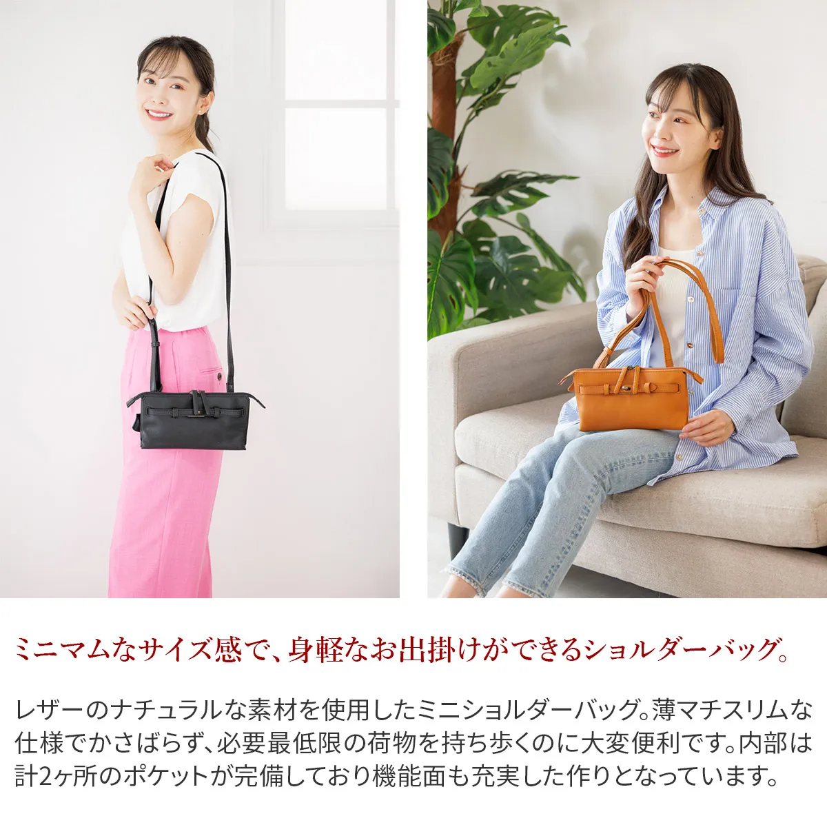きちんと感もありながら少しカジュアルなデザインの雰囲気とシンプルな仕上がりでデイリーに使用していただけます。 ミニマムサイズのショルダーバッグです。正面のひねり金具がアクセントになり、デザイン性のあるアイテムです。外出にマストな貴重品は収納でき、スマートに外出していただけます。取り外し可能なキーリングが付いています。