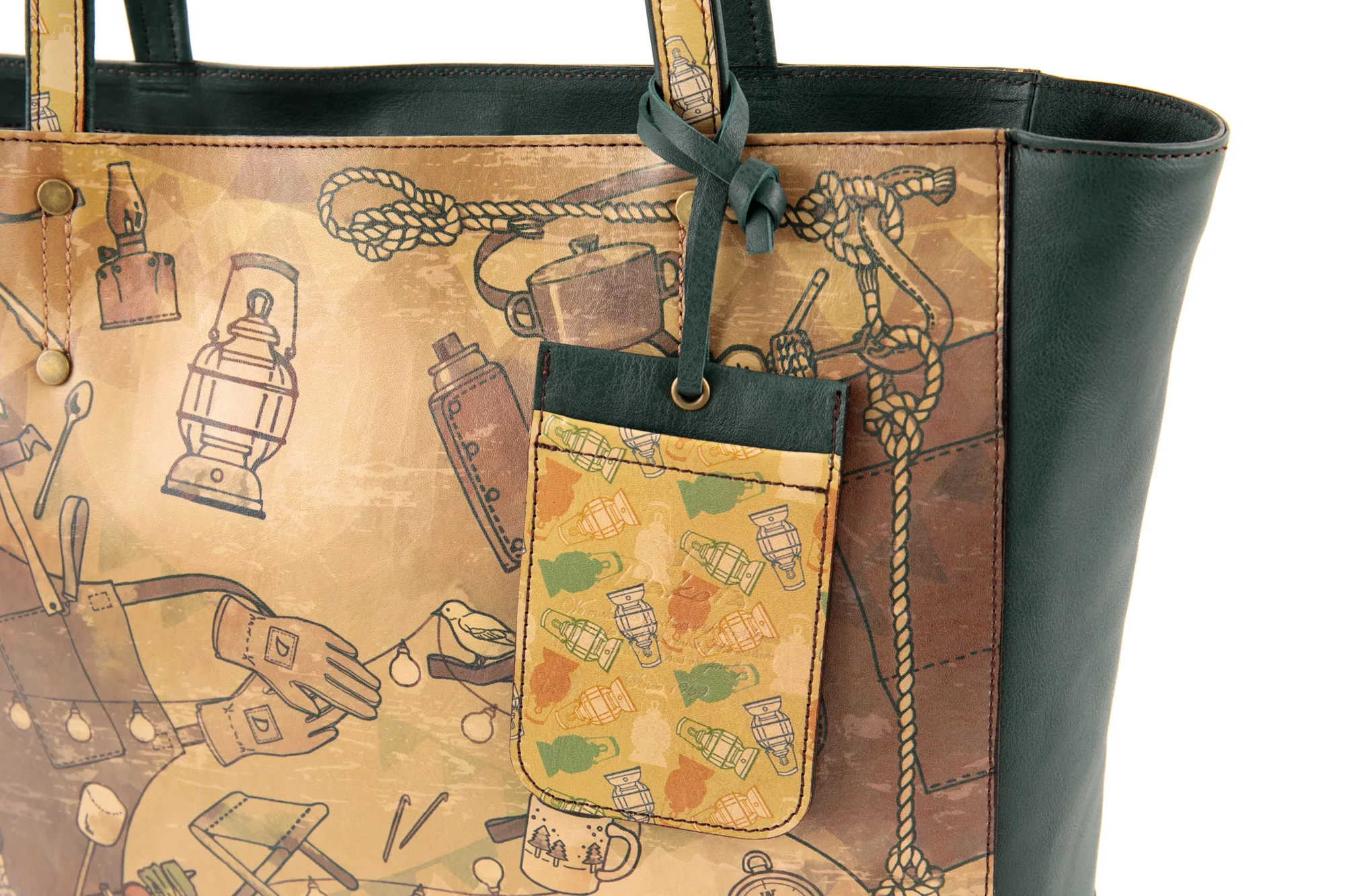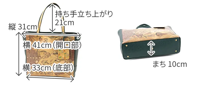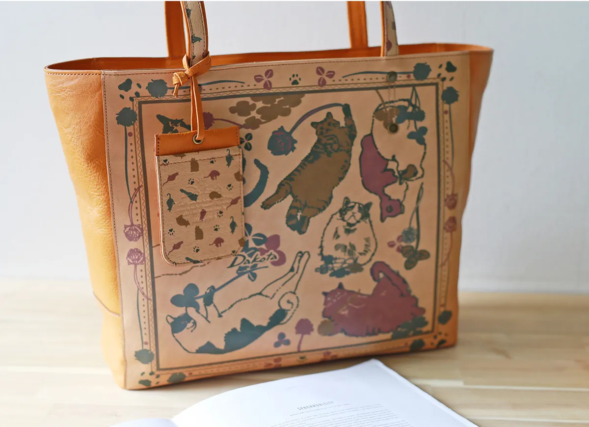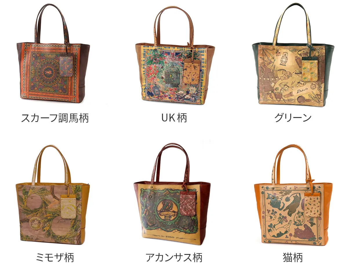 「大人のおしゃれキャンプ」がテーマ。 革小物でDakota風にアレンジしたキャンプグッズを散りばめてスカーフ風の柄に仕上げました。 自然と共に過ごす穏やかなひとときを思い出させてくれるリラクシングなシリーズです。 ソフトな手触りの牛革に、プリントデザインが映える逸品です。 ファスナー式のメイン開口部両サイドにオープンポケットが備えられており、 書類や普段使いに必要な荷物の整理に大変便利です。 収納力に優れており、デイリー使いはもちろん、ご旅行にもお使いいただけるサイズ感が 魅力のトートバッグです。
