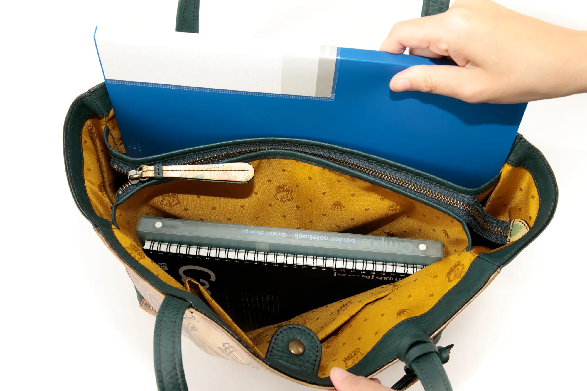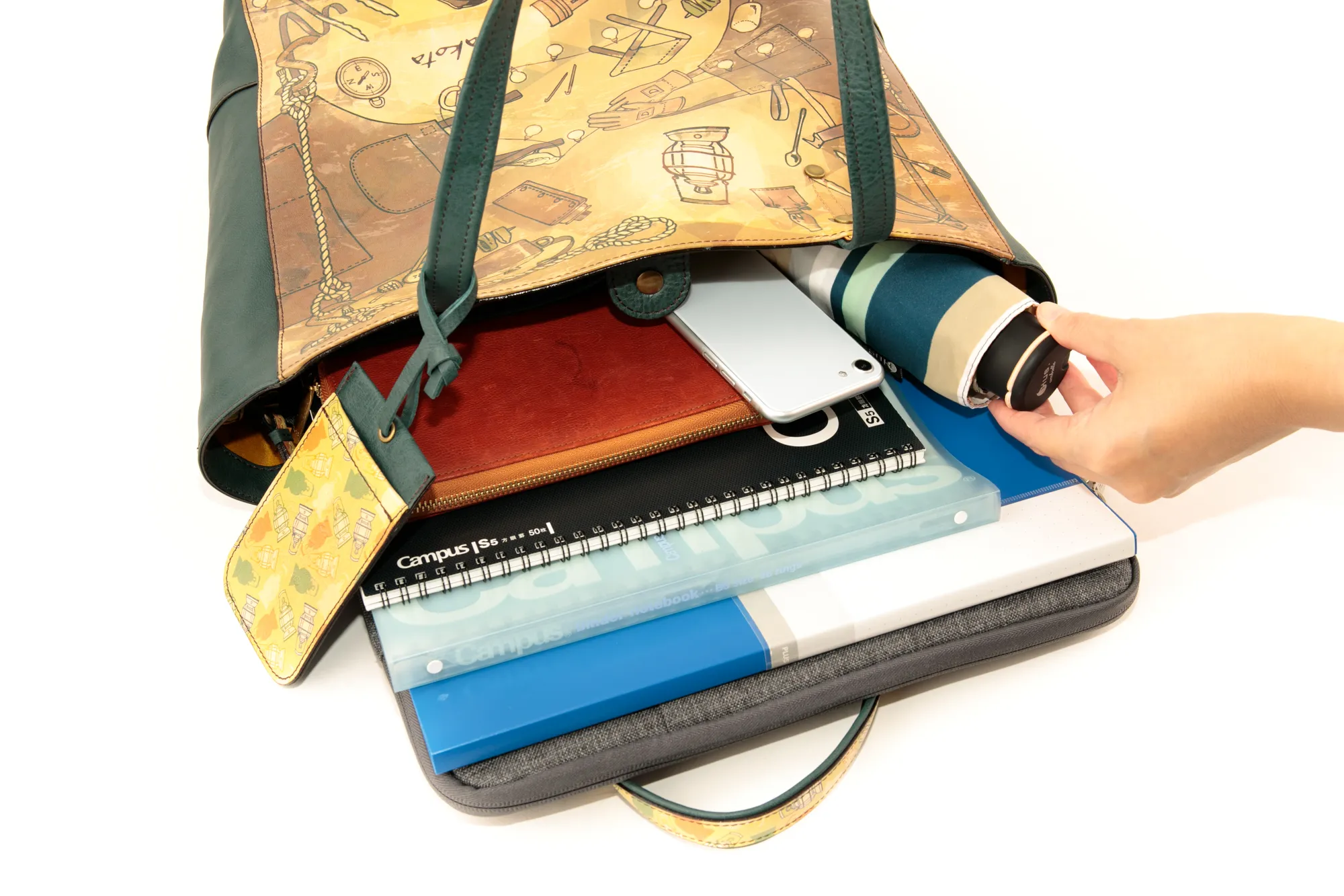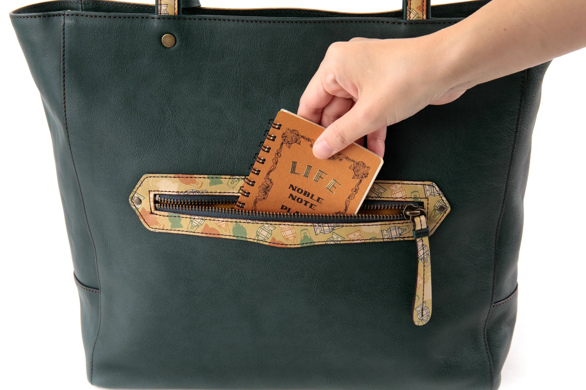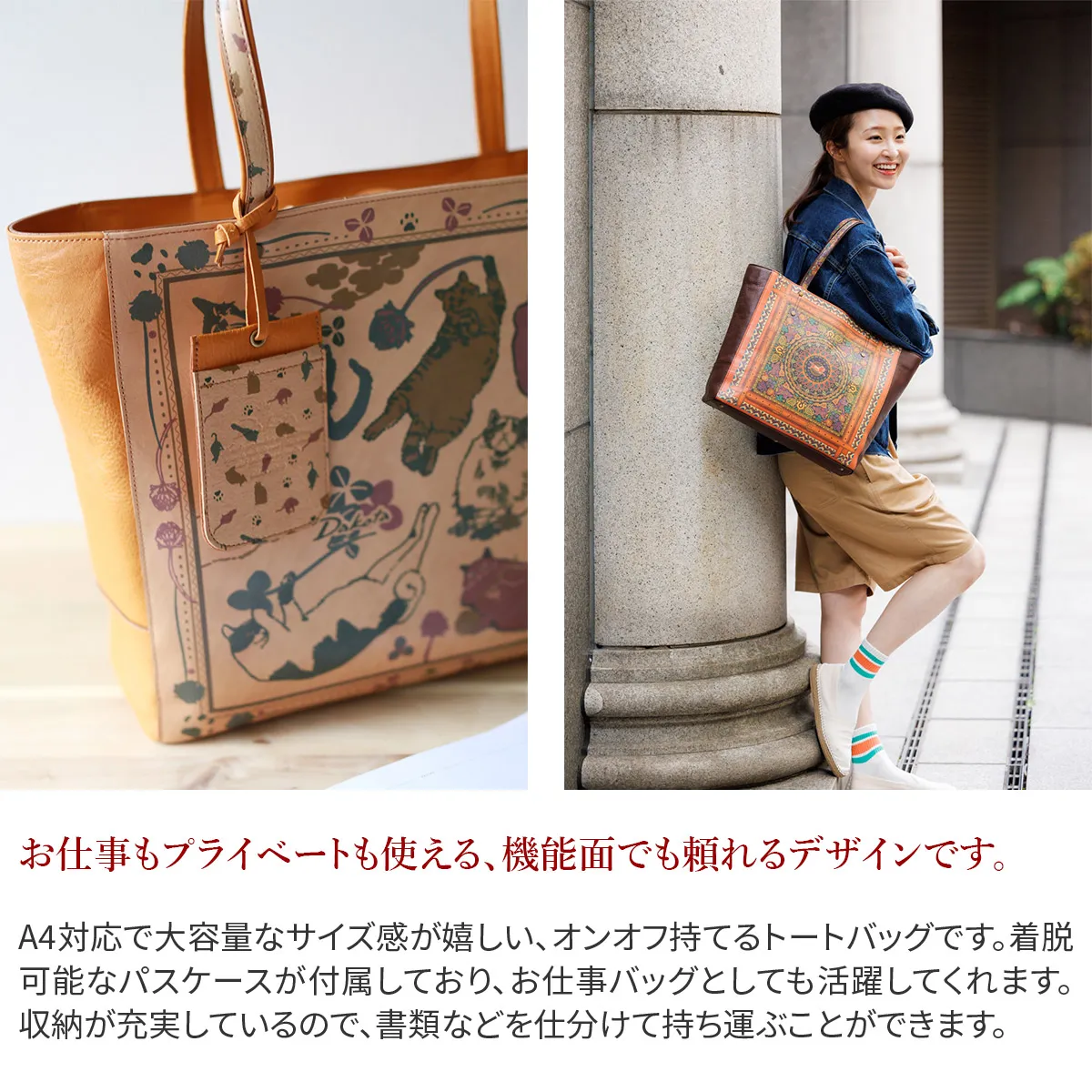 「大人のおしゃれキャンプ」がテーマ。 革小物でDakota風にアレンジしたキャンプグッズを散りばめてスカーフ風の柄に仕上げました。 自然と共に過ごす穏やかなひとときを思い出させてくれるリラクシングなシリーズです。 ソフトな手触りの牛革に、プリントデザインが映える逸品です。 ファスナー式のメイン開口部両サイドにオープンポケットが備えられており、 書類や普段使いに必要な荷物の整理に大変便利です。 収納力に優れており、デイリー使いはもちろん、ご旅行にもお使いいただけるサイズ感が 魅力のトートバッグです。