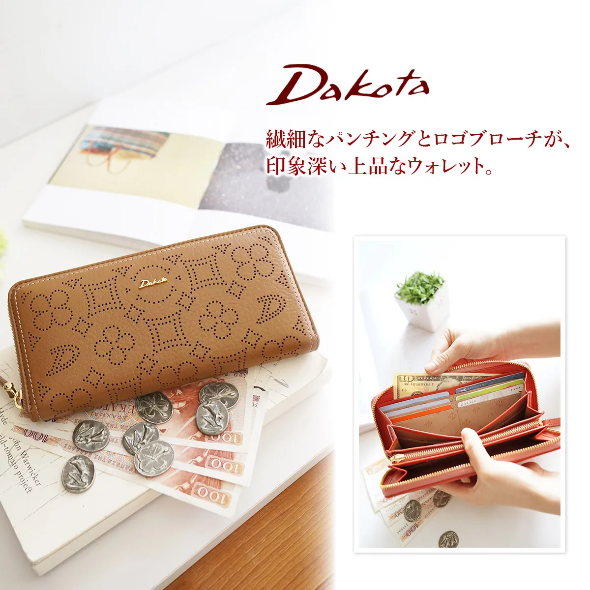花やクローバーのモチーフを細かなパンチングで表現しました。ふっくらとしたタッチ感とベーシックな柄ゆきは持ちやすく、正統派な雰囲気。引手金具までブランドロゴが入り細部にも拘っています。カジュアルさの中にも品が漂う女性らしいシリーズです。 上品で繊細なパンチングが美しく、すっきりしたフォルムが魅力的です。見た目以上の収納力を持ち、整理して収納することができます。