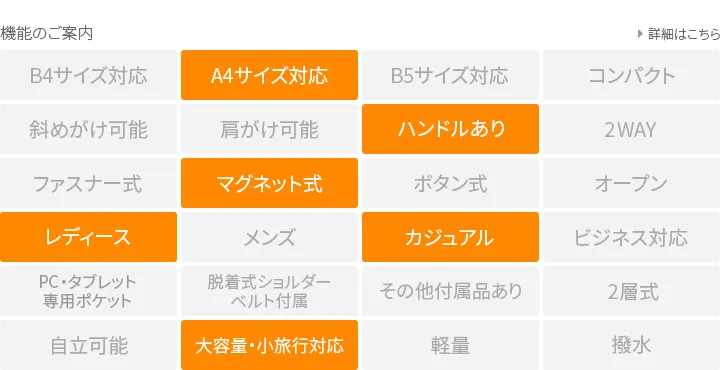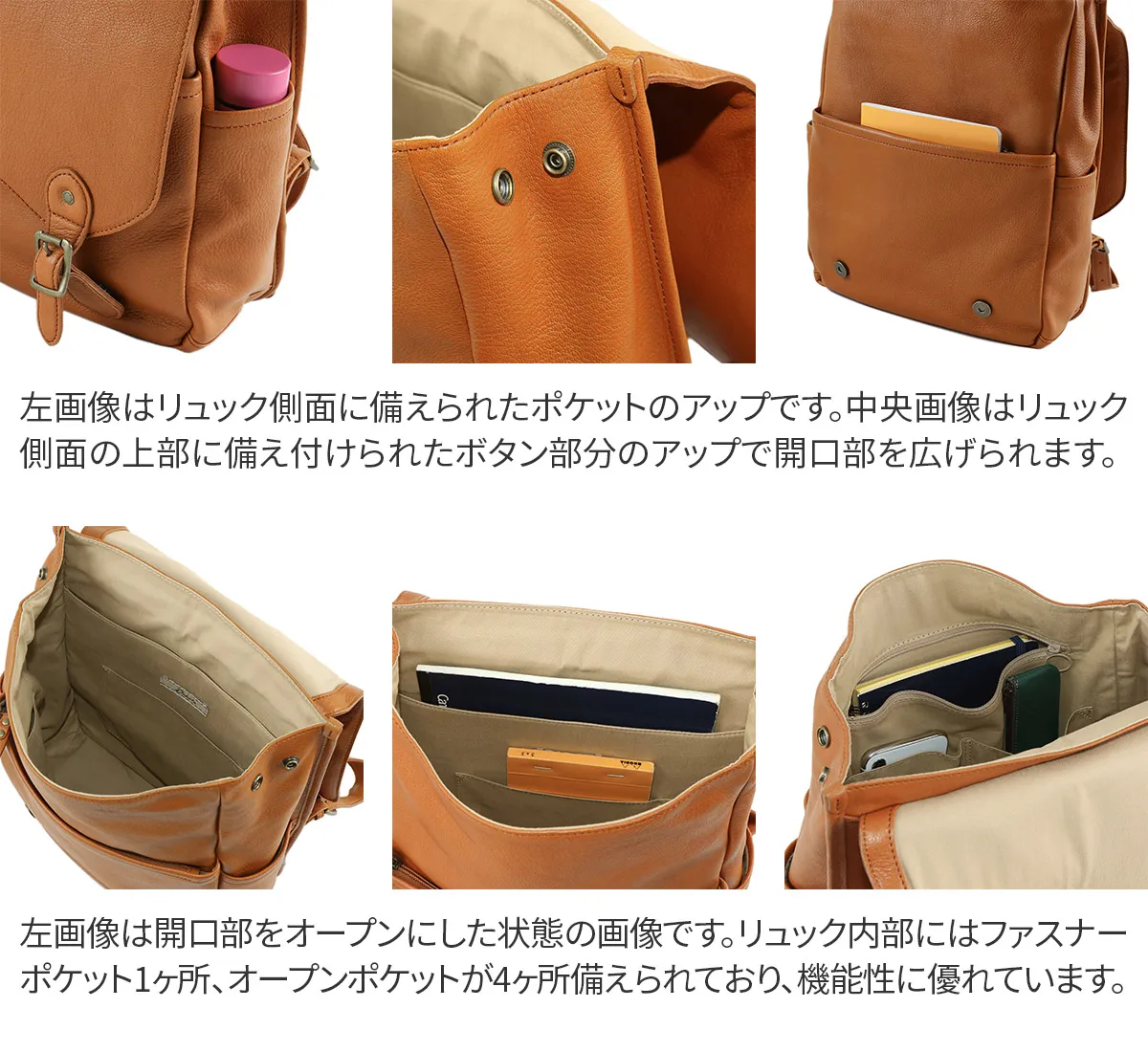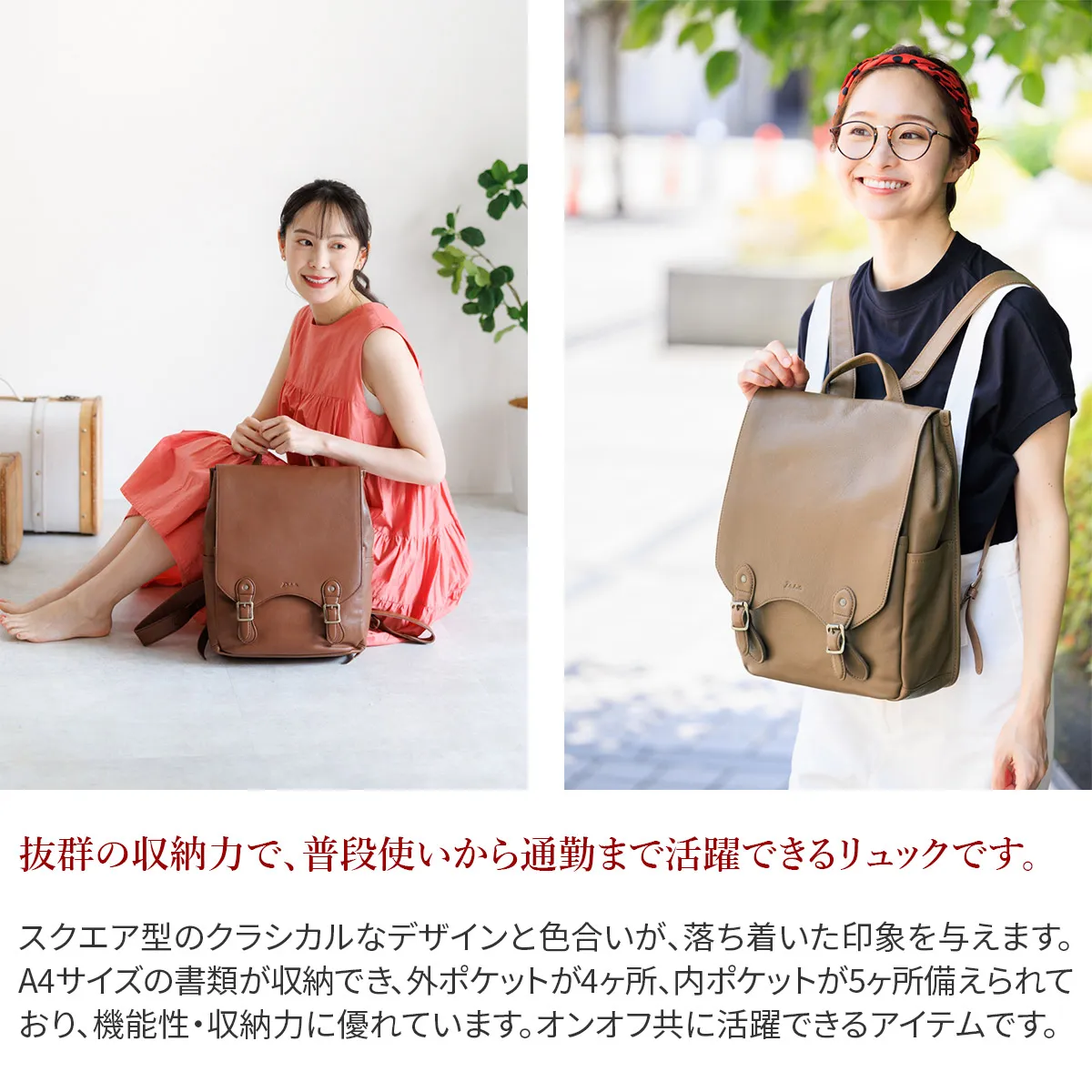 細かなシボ感が特徴の山羊革を使用したシリーズ。 デザインや使い易さにこだわりつつ軽量に仕上げているので、 普段使いからビジネスまで様々なシーンで活躍します。 スクエア型のクラシカルなデザインと色合いが、落ち着いた印象を与えます。A4サイズの書類が収納でき、外ポケットが4ヶ所、内ポケットが5ヶ所備えられており、機能性・収納力に優れています。オンオフ共に活躍できるアイテムです。