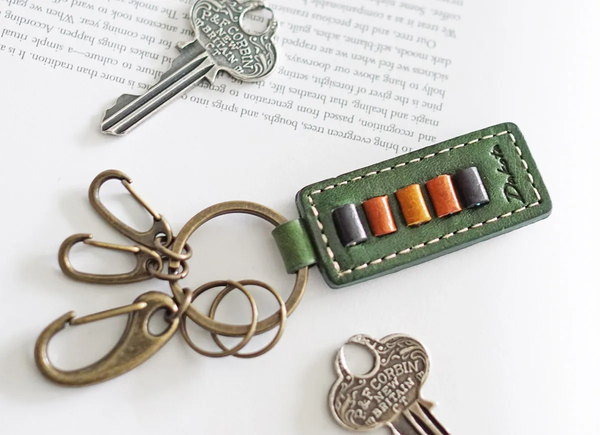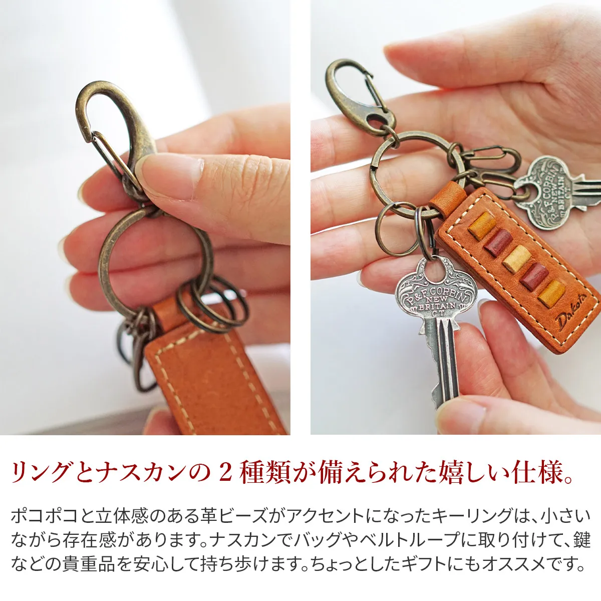 長くお使いいただけるよう、愛でて頂けるようエイジングが魅力のイタリアンレザーに革で出来た小さなビーズがあしらわれています。クラフトマンシップと上質感を感じさせるアクセントとして効いています。使うほどに丸みを帯びる革ビーズ、艶と深みが増す革色。一時的な時流に流されることなく、お使いいただける方の日常に溶け込み成長してゆきます。 豊かなシボを持った、風合いの良いイタリアンレザーを使用したキーホルダー。鍵をリングとナスカンの2種類から選び、取り付けることができます。エイジングを楽しみながら長く愛用できるレザー小物は、大切な方への贈り物や自分へのご褒美にもオススメです。