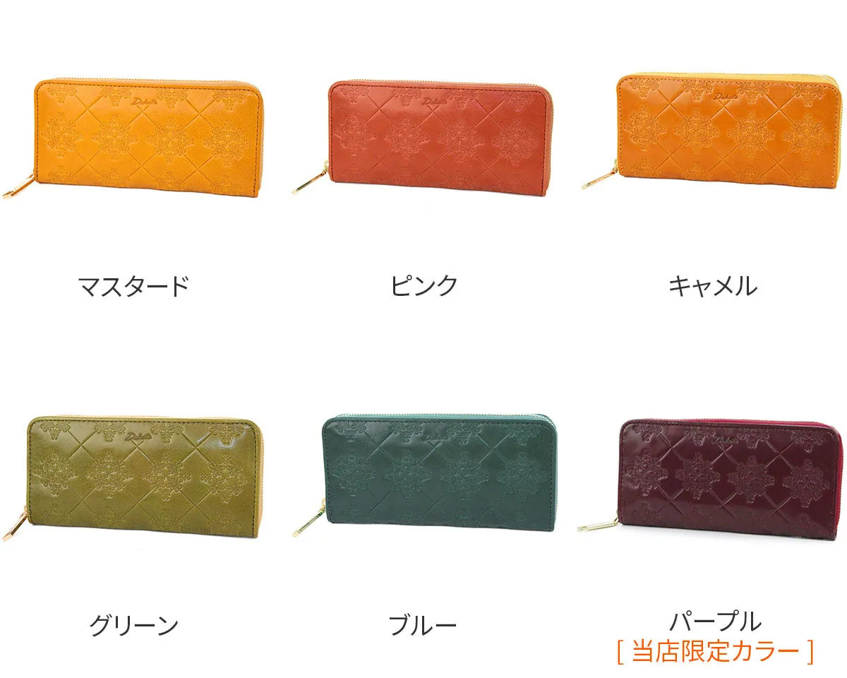 一見シンプルな中にも女性らしいお花の型押しや、プラスワンの機能性が光るこだわりの詰まったモナシリーズ。経年変化を楽しめるイタリアンレザーを使用した、飽きずに長く一緒にいられるお財布です。 ソフトで少し張りのある革に、愛らしいオリジナルの花柄の型押しを施したロングウォレットです。ラウンドファスナー開閉なので紙幣やカードをたくさん収納していただいてもスマートなフォルムを保ちます。