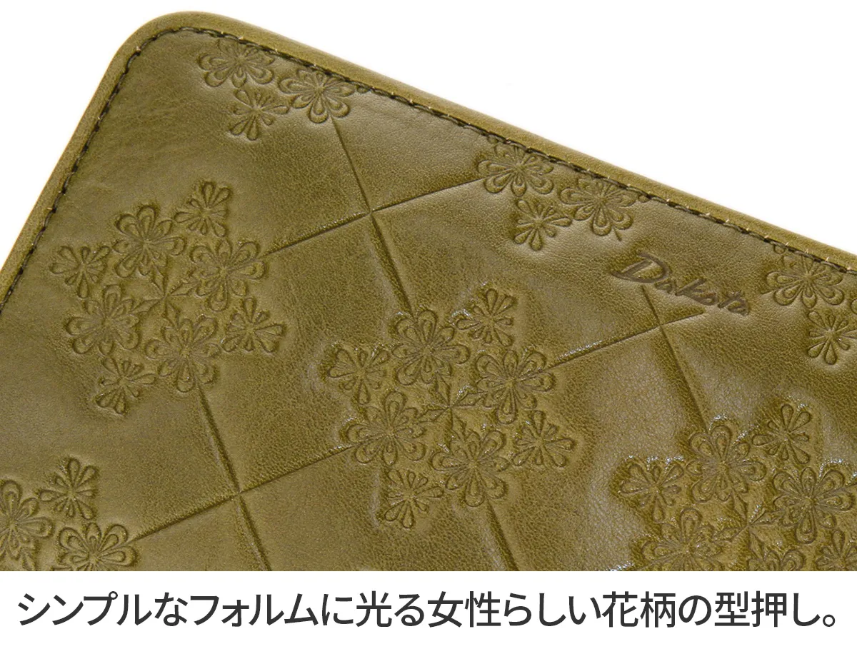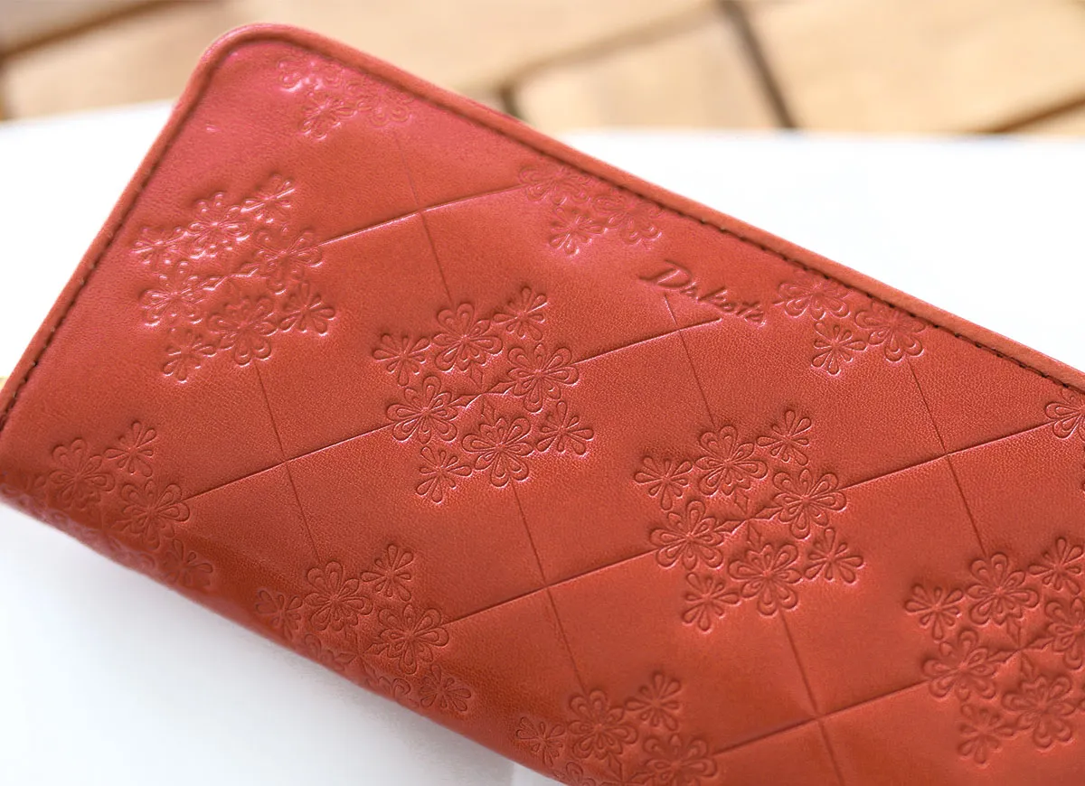 女性の心をくすぐるお花の型押し、 すっきりとした印象のラウンドファスナー仕様。