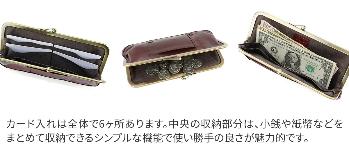 お花のカタチをしたカシメがデザインポイントのリードクラシックシリーズ。レトロ可愛くてクラシカルな雰囲気を醸し出しています。 シンプルなデザインなのに魅力的で大人気なこのシリーズにがま口タイプの長財布が仲間入りしました。クラッチバッグの様に片手に持って歩いてみたくなるような素敵なお財布です。カード入れは6ヶ所、お札入れは1ヶ所とスッキリと整理できるので、かさ張らずにスタイリッシュにお持ち頂けます。