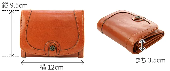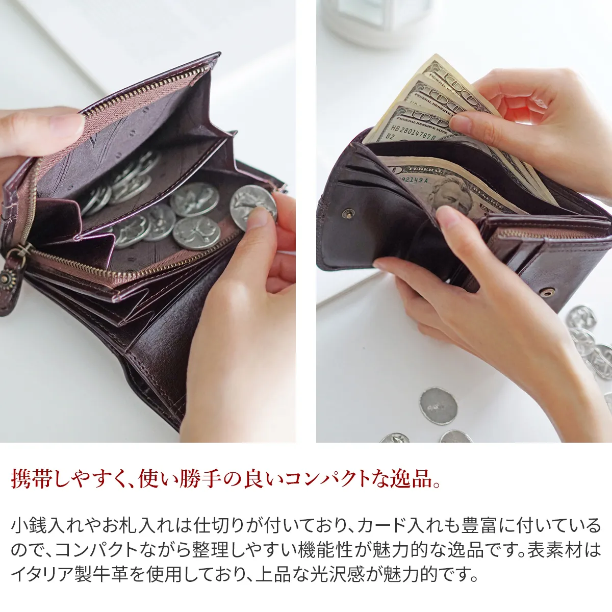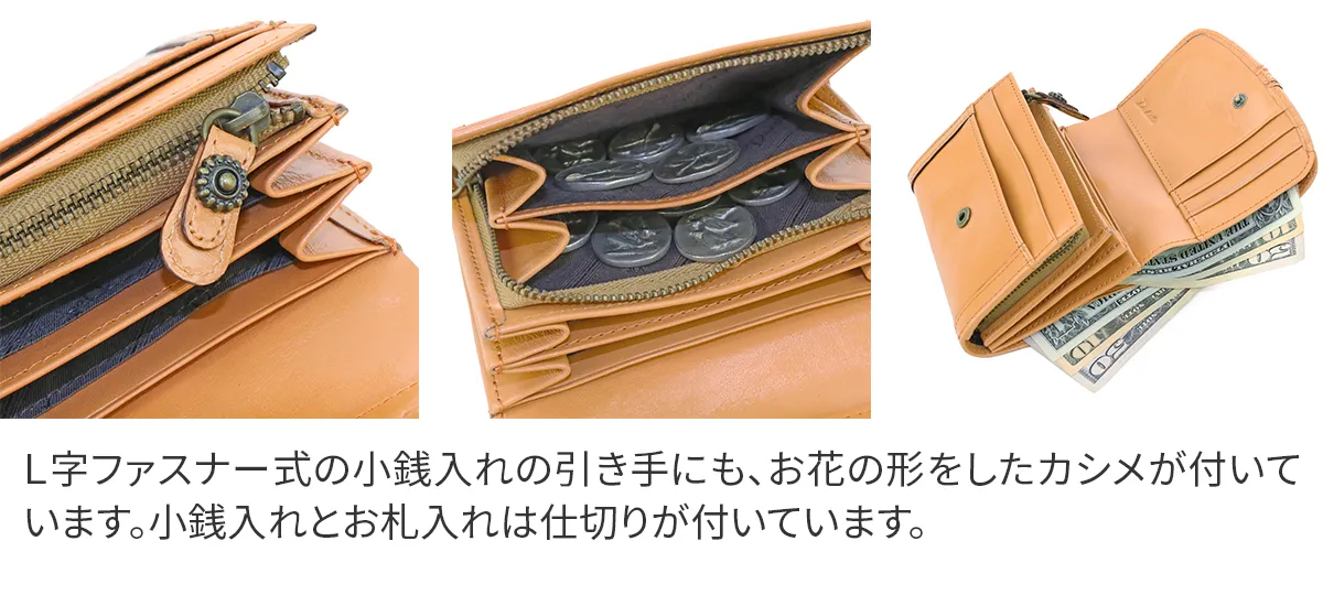 ジャバラ財布をお探しの方にはぴったり。飽きのこないシンプルなフォルムで永くご使用いただけます。ファスナーのつまみに付いたマーガレットのカシメもかわいいです。イタリアの革ならではのカラーリングにも注目です。