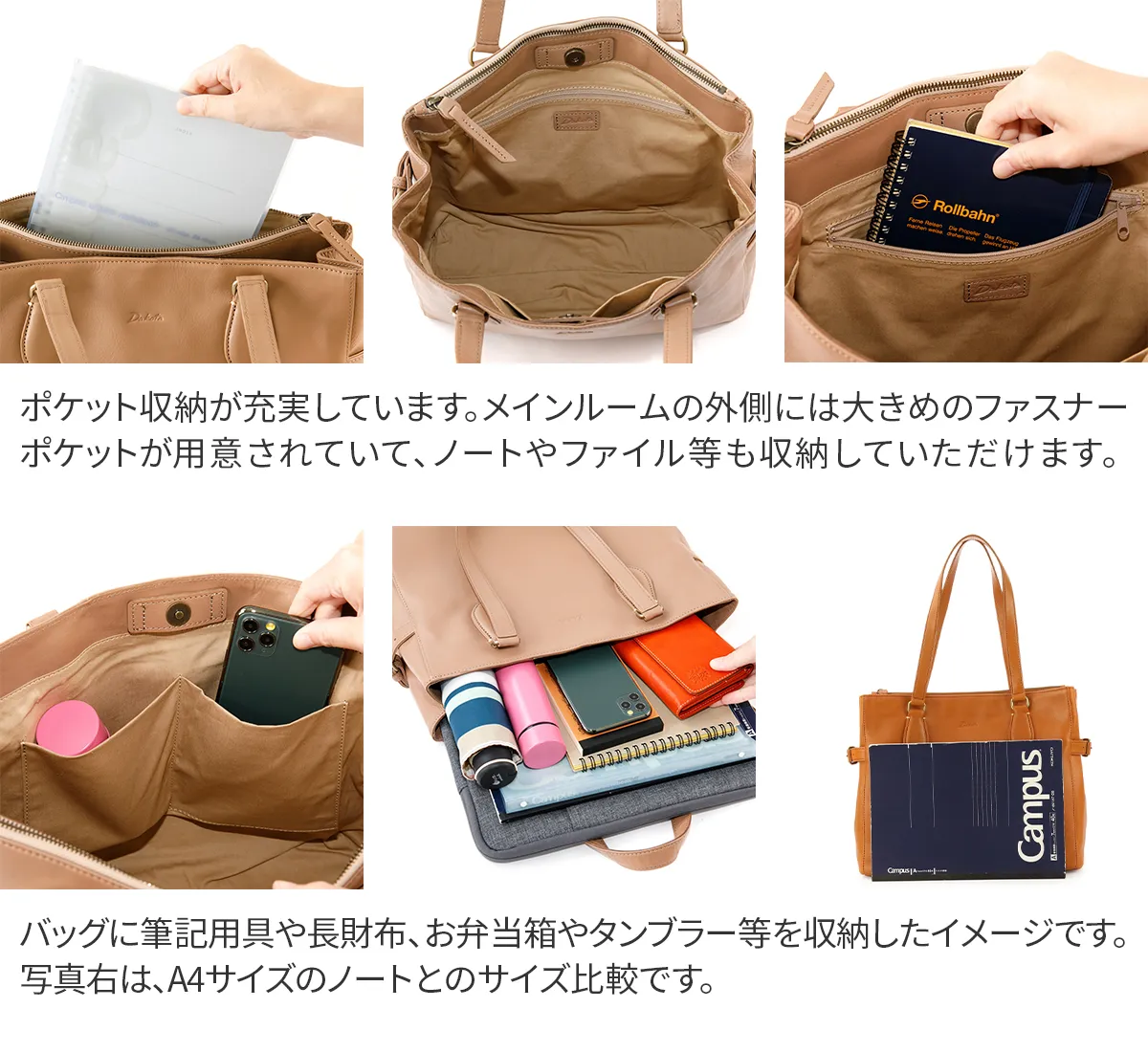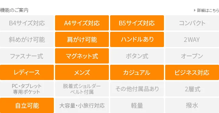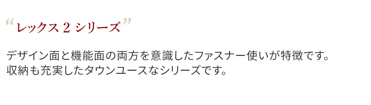 デザイン面と機能面の両方を意識したファスナー使いが特徴です。収納も充実しているのでオンにも対応したタウンユースなシリーズです。 両サイドのベルトがアクセントになっており、容量に合わせて3段階の調節が可能です。持ち手は長さがあるので肩がけしてお持ちいただけます。
