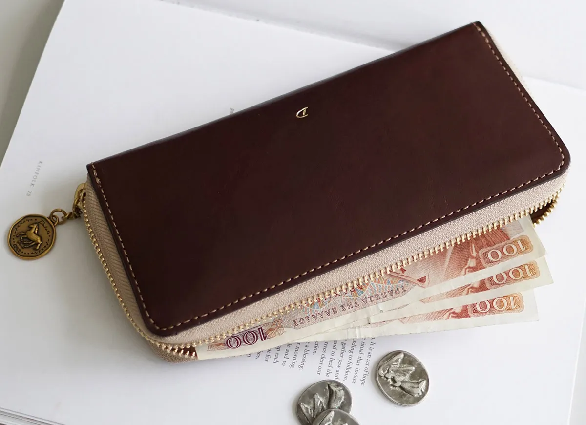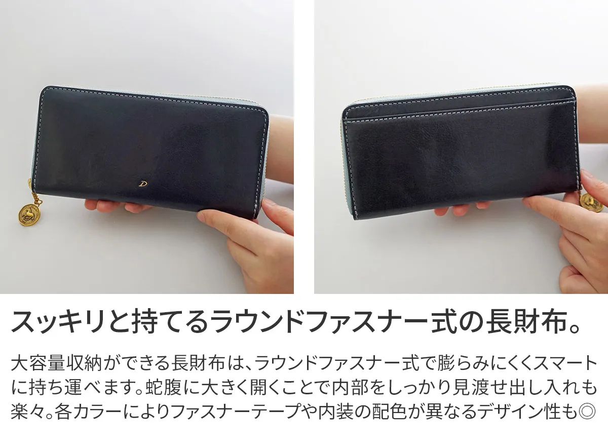 “軽やかに走る馬が運んでくる「幸せ」を「幸運を受け止める」上向きの馬蹄でキャッチする”馬と馬蹄マークが刻印されたアンティークコイン風の引手チャームがポイント お財布本体には美しくエイジングするイタリア製のバケッタレザーが使用されています。 使うたびに艶が増す、革のエイジングを楽しめる長財布。内装は、ポケットがたくさん設けられており、大容量収納が可能です。ファスナーポケットが1ヶ所備えられており、中にはカードポケットもついています。鍵やアクセサリーなどの小物や大切なカード収納に便利です。