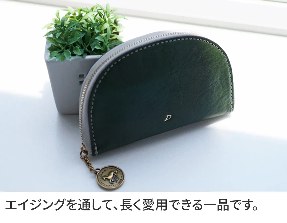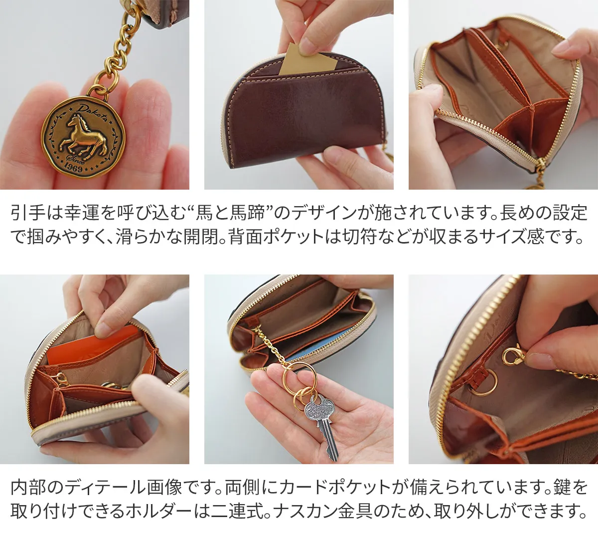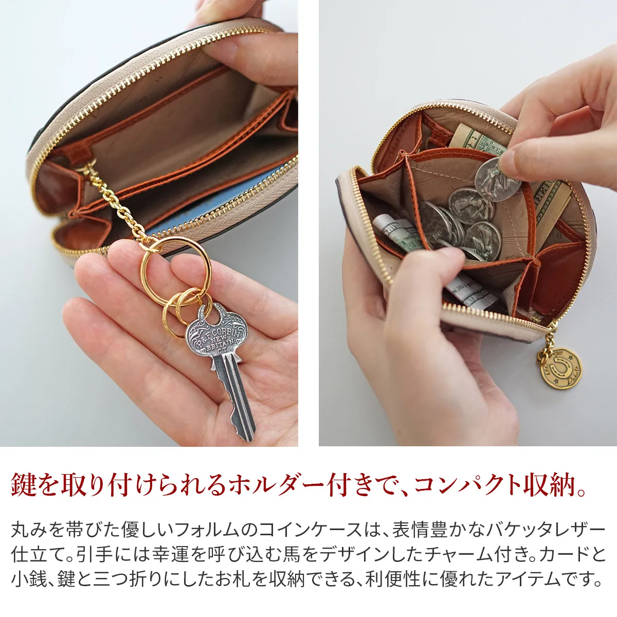 “軽やかに走る馬が運んでくる「幸せ」を「幸運を受け止める」上向きの馬蹄でキャッチする”馬と馬蹄マークが刻印されたアンティークコイン風の引手チャームがポイント お財布本体には美しくエイジングするイタリア製のバケッタレザーが使用されています。 使うたびに艶が増す、革のエイジングを楽しめるコインケース。小銭入れの両サイドに三つ折りにした一万円札が収納可能です。鍵を取り付けられるホルダー付きで、利便性に優れています。