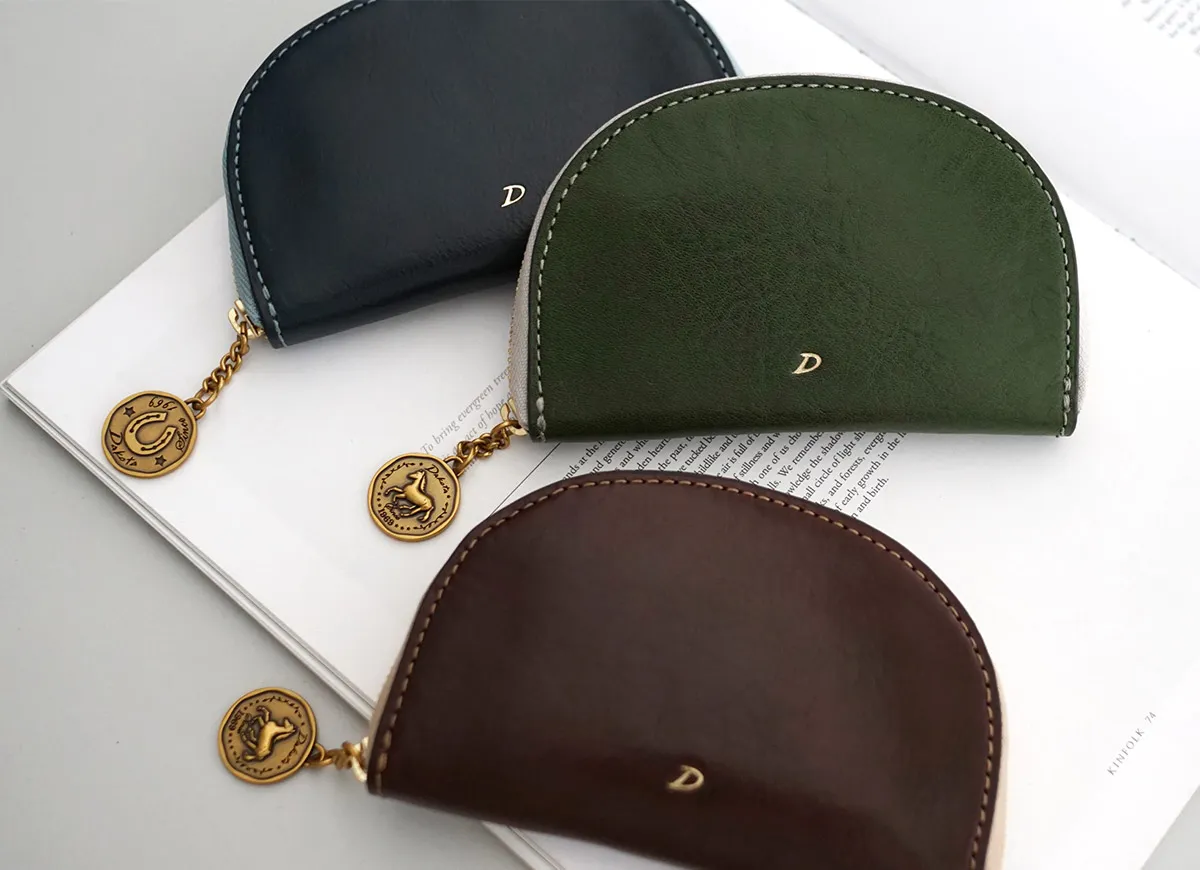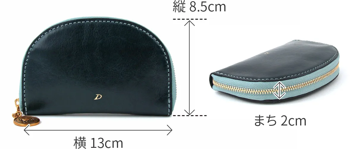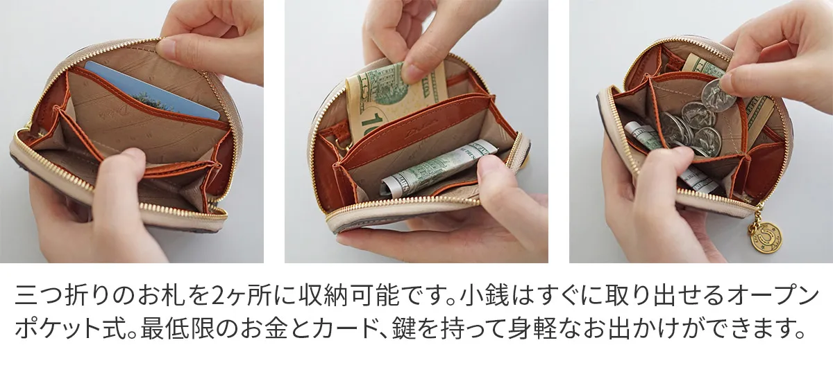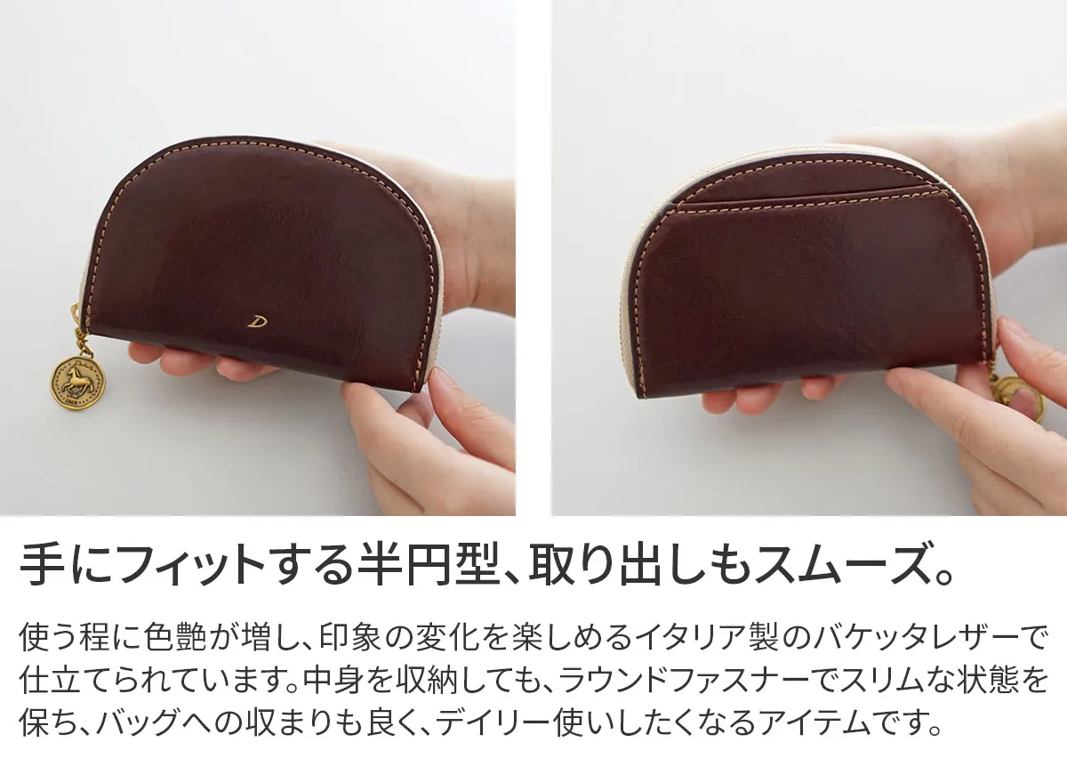 “軽やかに走る馬が運んでくる「幸せ」を「幸運を受け止める」上向きの馬蹄でキャッチする”馬と馬蹄マークが刻印されたアンティークコイン風の引手チャームがポイント お財布本体には美しくエイジングするイタリア製のバケッタレザーが使用されています。 使うたびに艶が増す、革のエイジングを楽しめるコインケース。小銭入れの両サイドに三つ折りにした一万円札が収納可能です。鍵を取り付けられるホルダー付きで、利便性に優れています。