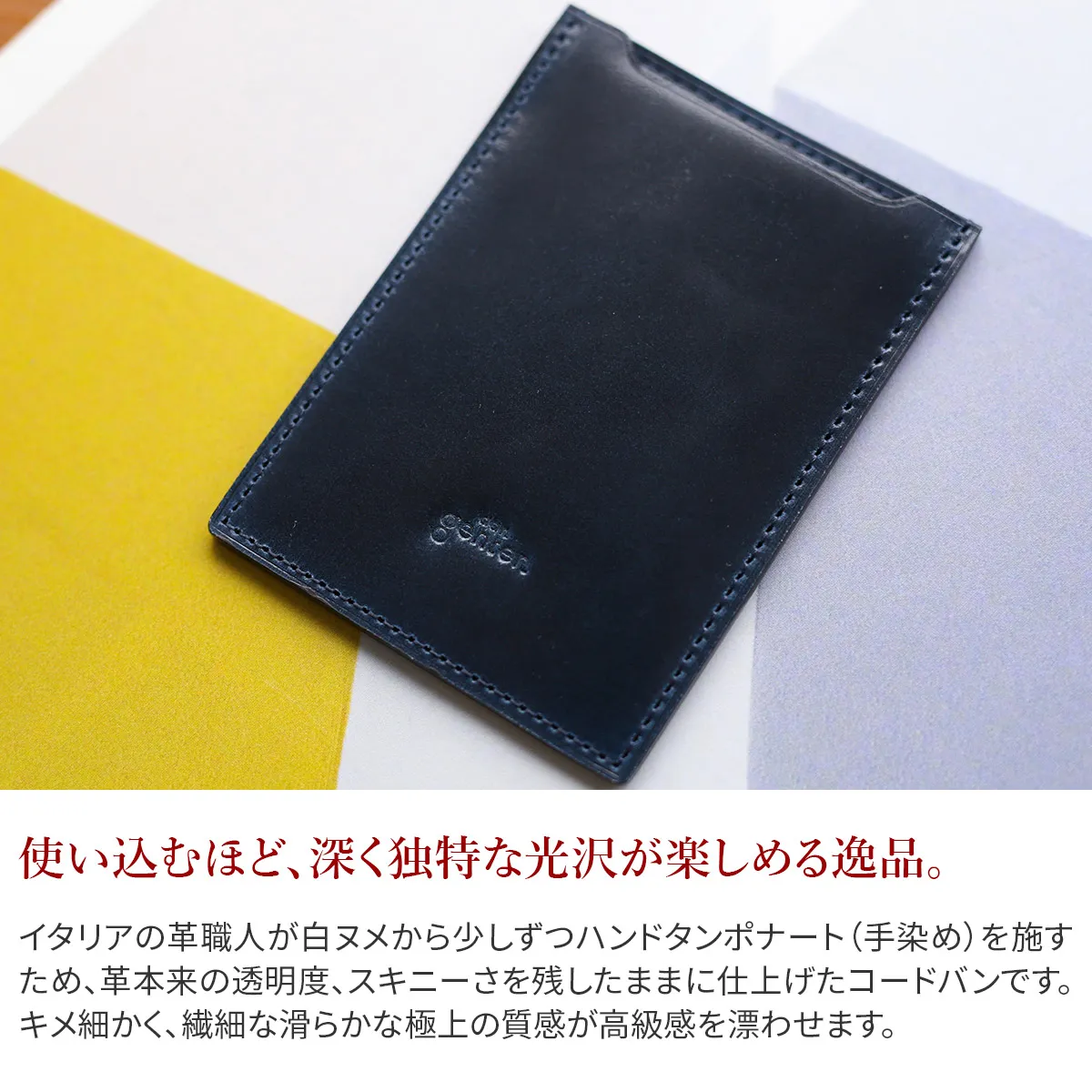 イタリアン製コードバンを贅沢に使用したミニウォレットとスモールグッズのシリーズ。 味わい深い奥行きのあるコードバンならではの銀先と、その革の魅力を最大限に活かすべく、質実剛健に仕上げられています。 その指先で触れるたびに伝わってくる、まるで陶器のようなコードバンならではの極めて繊細な滑らかさが、ひときわ用具としての愛着を深める所以です。