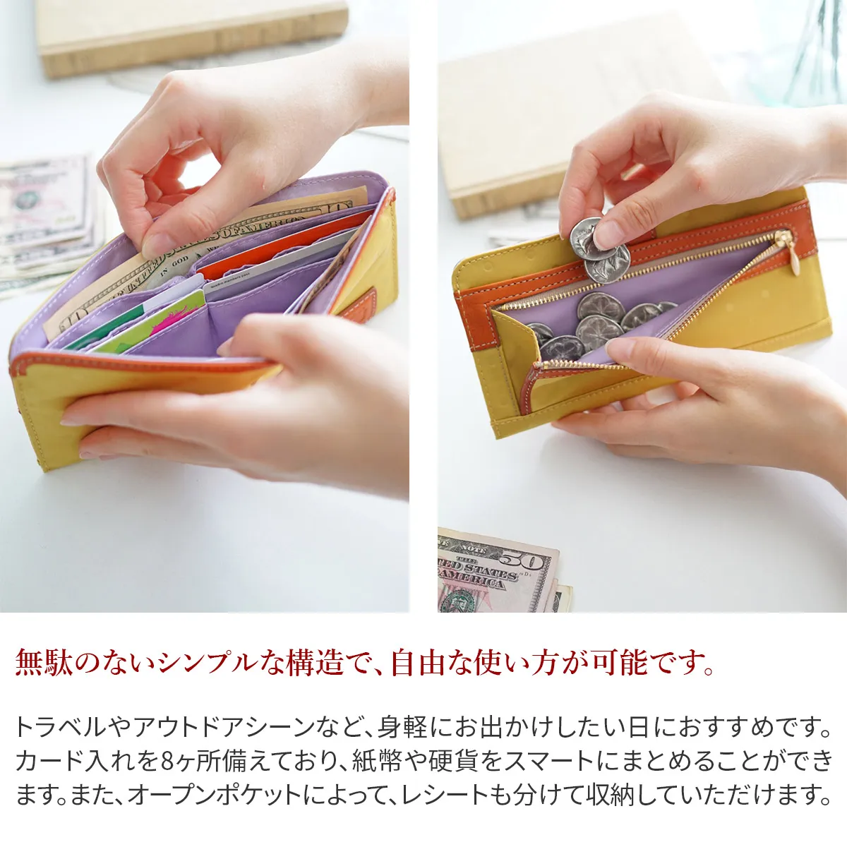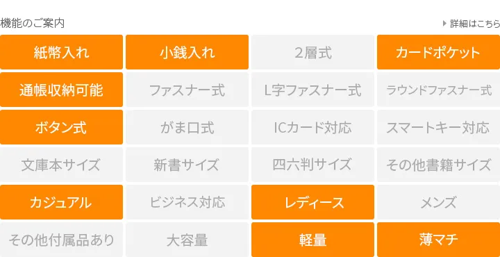 スマートな薄さのお財布や旅先で便利なお財布ポシェットなど使い勝手と軽さにこだわった、お出掛けが楽しくなるシリーズ。生地にエンボスされたさり気ないドット柄も大人可愛いポイントです。 スリムかつコンパクトですが、ポケットをたくさん十分備えているので、整理して収納が可能。小銭入れはファスナー開閉ですが、片マチ付きで硬貨が取り出しやすい仕様です。 スナップボタンを開けると、お札やカード入れが備わっています。カジュアルスタイルにぴったりな逸品です。