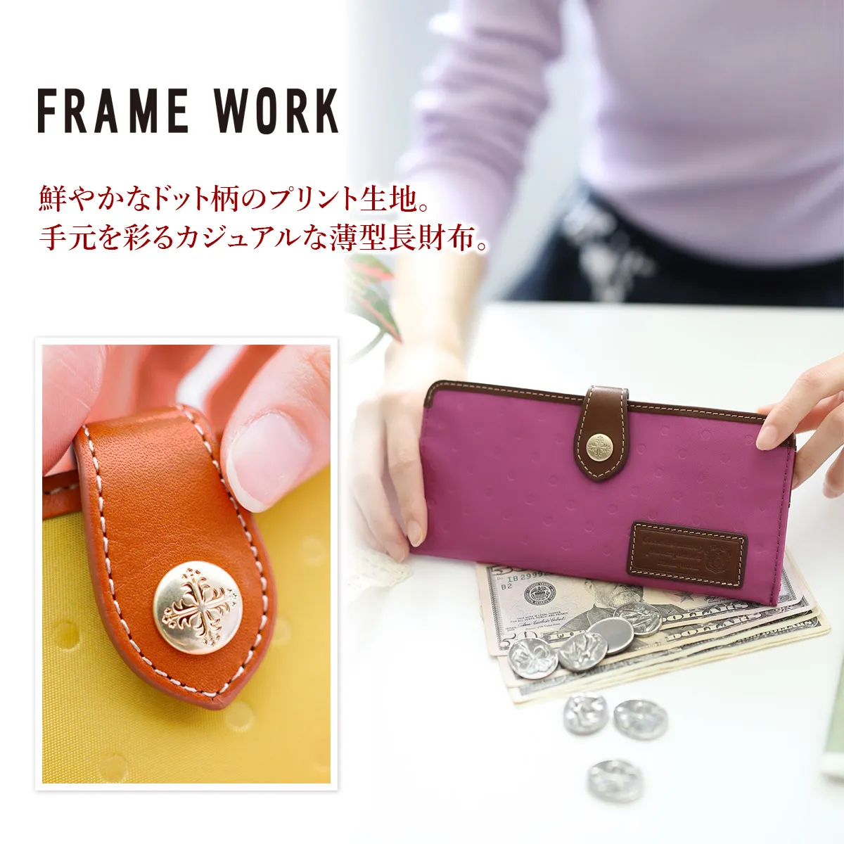 FRAME WORK(フレームワーク) ボヤージュ 小銭入れ付き長財布 0048000(0047301) かさばらなず、気軽に持ち運べるロングウォレット 女性らしいデザインのナイロン生地×牛革