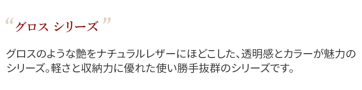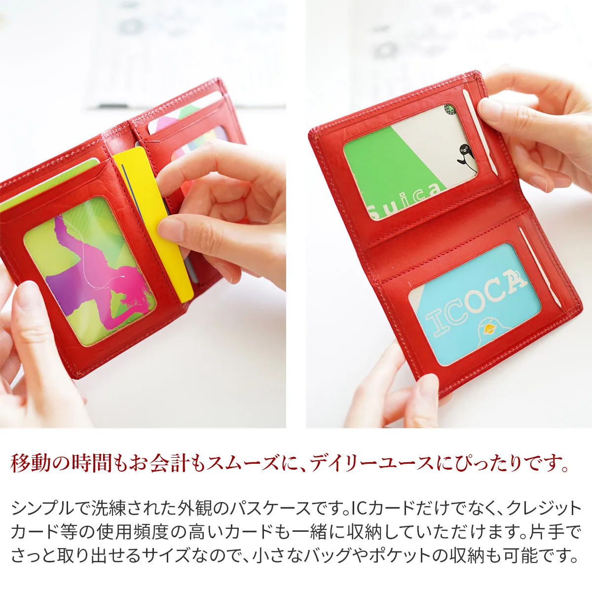 グロスのような艶をナチュラルレザーにほどこした、透明感とカラーが魅力のシリーズ。軽さと収納力に優れた使い勝手抜群のシリーズです。 シンプルですっきりとした外観のパスケースです。窓付きのポケット、カード入れ、フリーポケットが2ヶ所ずつ付いていて、しっかりと収納していただけます。 老若男女問わずお使いいただけるので、プレゼントにもオススメです。薄マチなので、ポケットや小さなバッグにも気兼ねなく収納していただけます。
