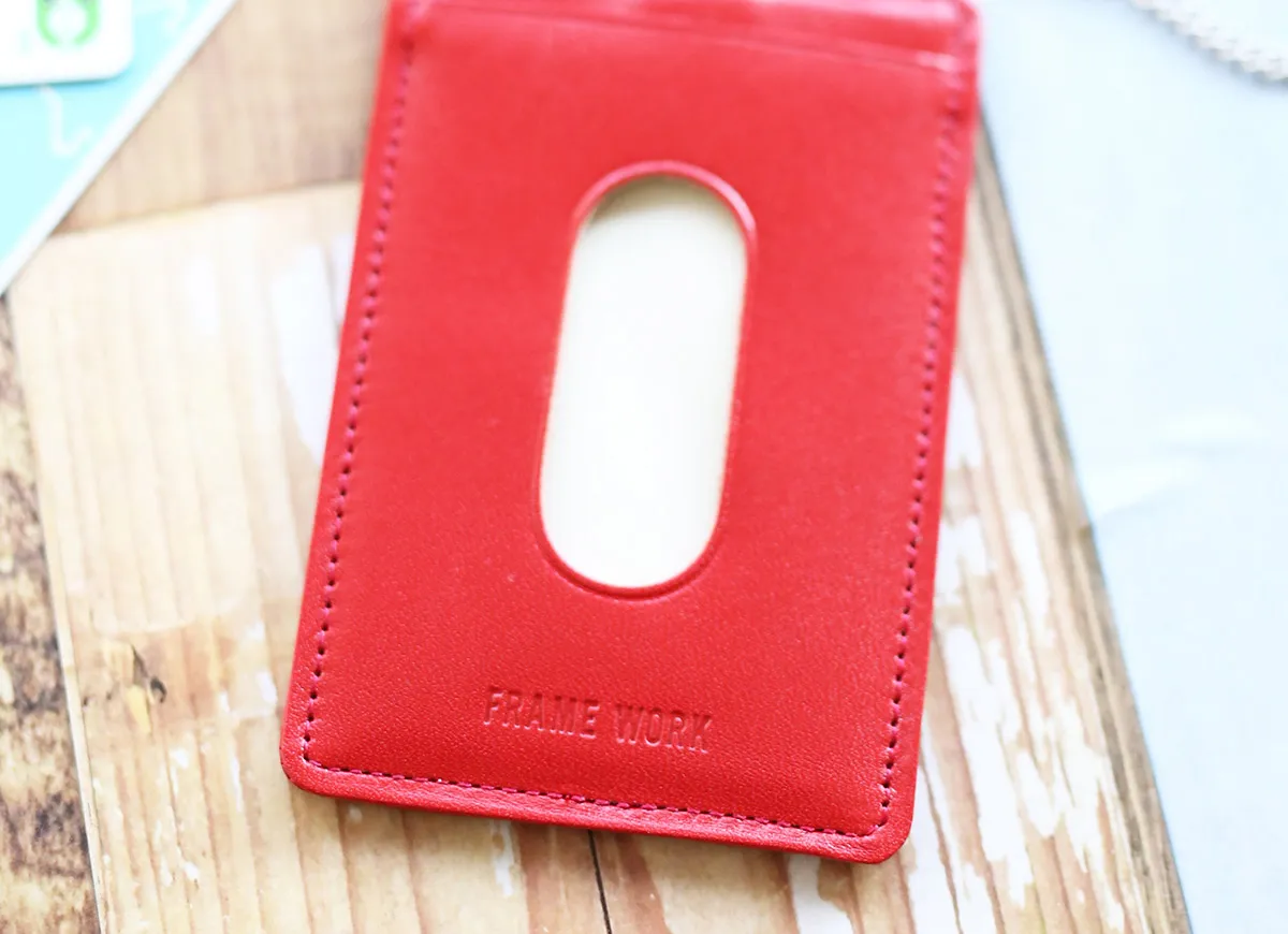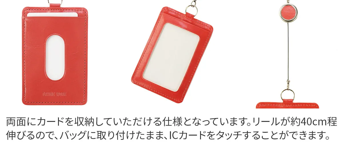 グロスのような艶をナチュラルレザーにほどこした、透明感とカラーが魅力のシリーズ。軽さと収納力に優れた使い勝手抜群のシリーズです。 リールが付いているので、バッグに取り付けることができ、改札のタッチもスムーズです。背面は窓付きで指でスライドしてカードを取り出すことができます。 両面に収納していただくことができるのもポイントです。シンプルですっきりとした作りなので、プレゼントにもオススメです。
