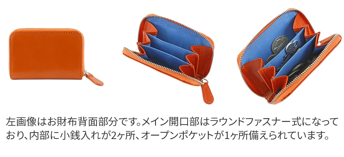 グロスのような艶をナチュラルレザーにほどこした、透明感とカラーが魅力のシリーズ。 軽さと収納力に優れた使い勝手抜群のシリーズです。 上品な艶感で華やかな印象のコインケースです。軽い質感で持ち心地の良さも魅力です。ラウンドファスナー式で大きく開き、視認性に優れています。硬貨を取り出しやすく、可愛らしいサイズ感ながら実用性も兼ね備えています。