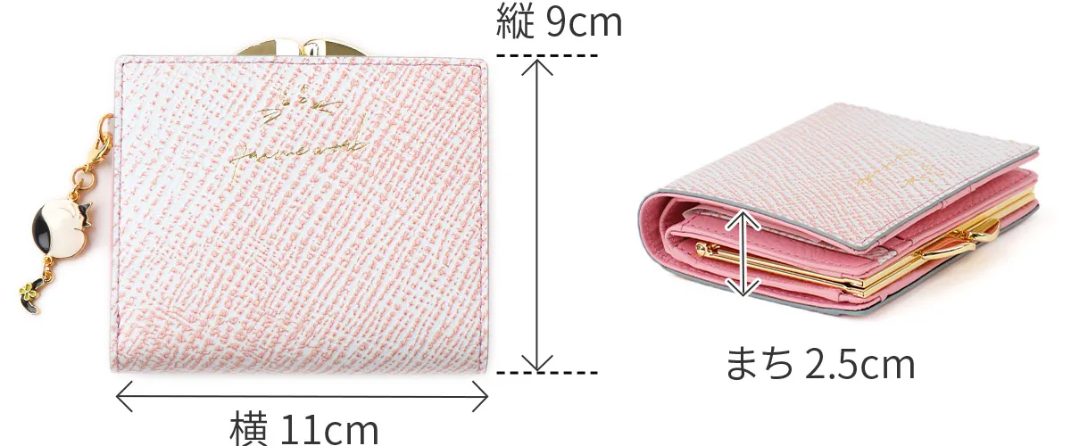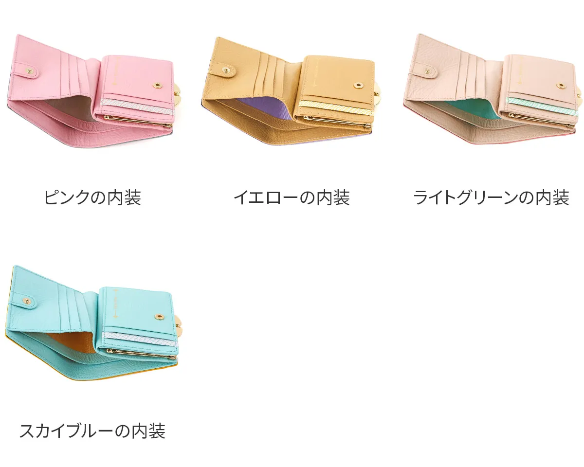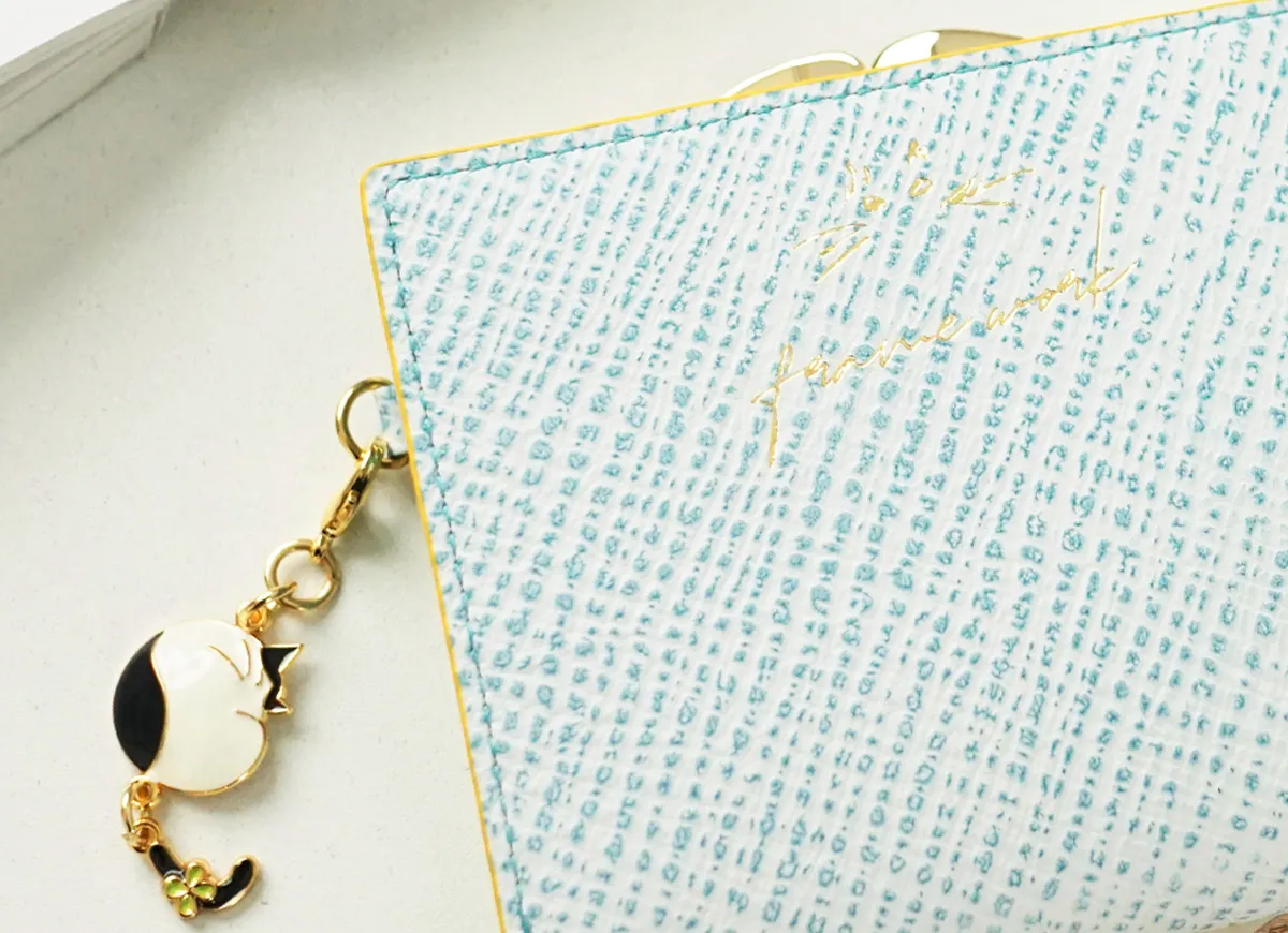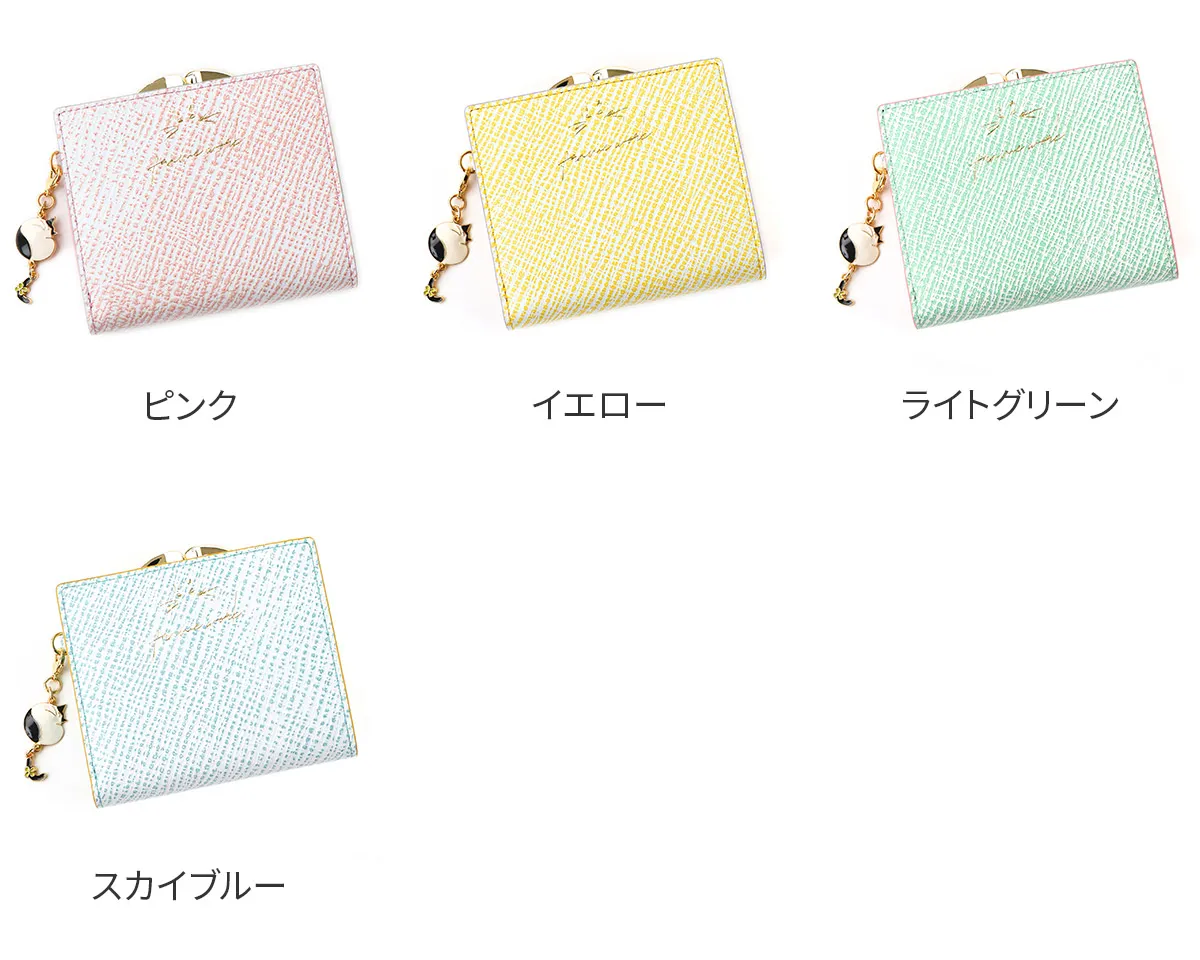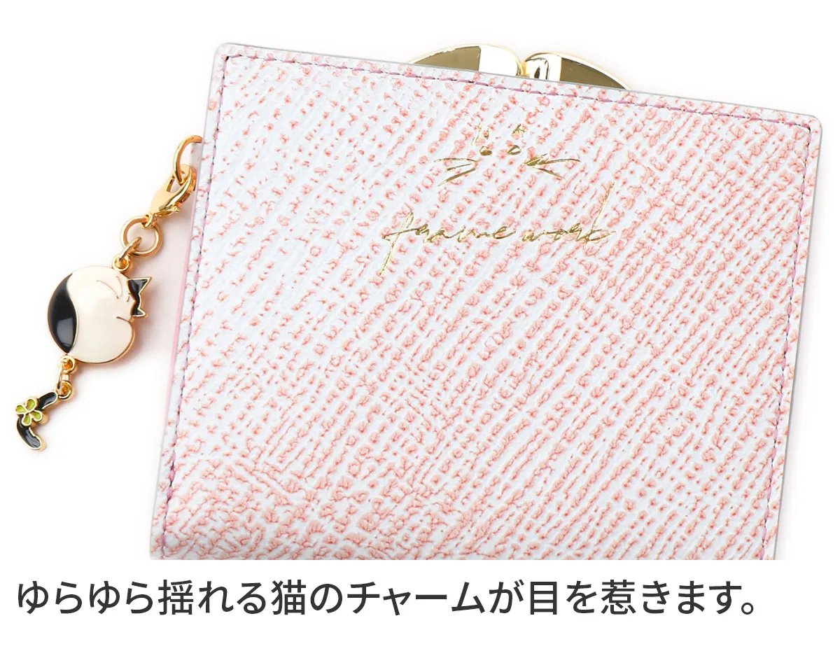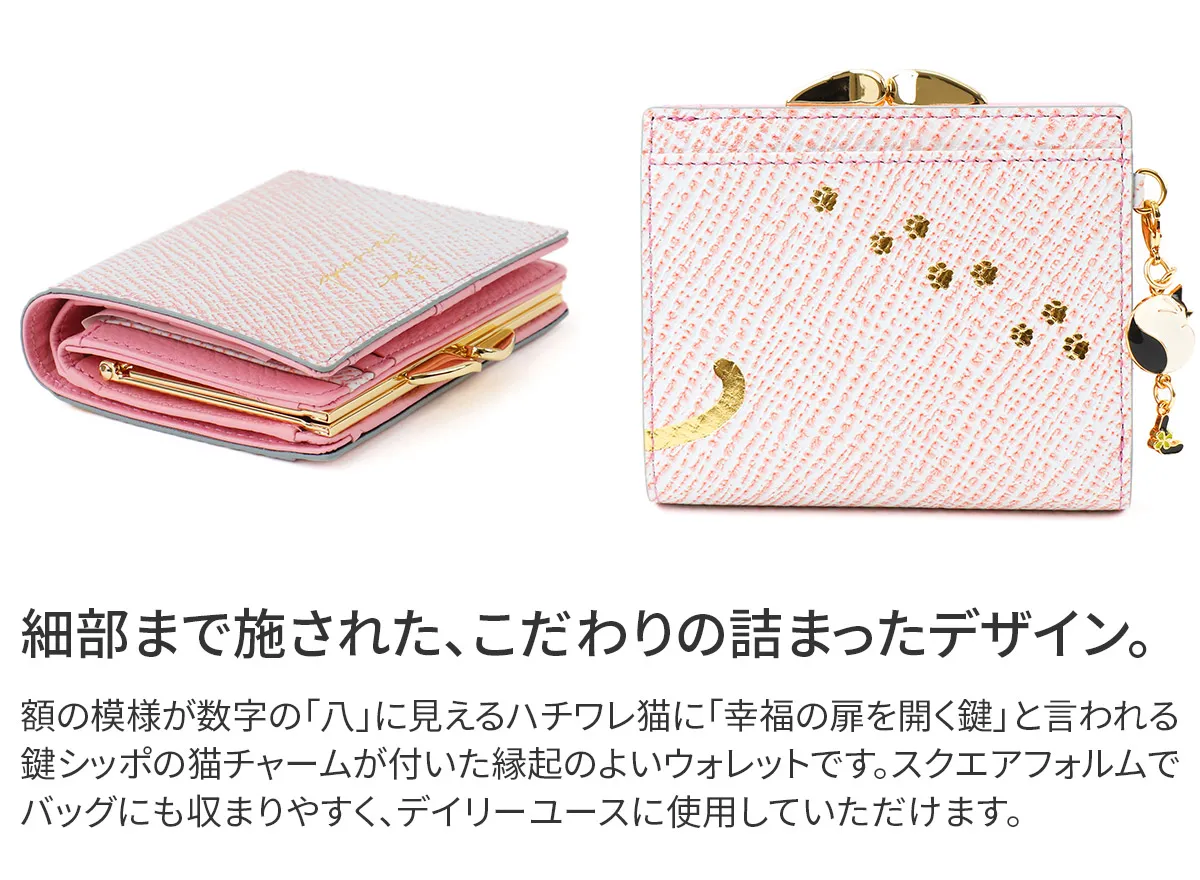 ゆらゆらと揺れる鍵シッポが可愛らしいはちわれ猫のチャームをアクセントにしたシリーズです。鍵のように先が曲がった猫のシッポは「幸運を引っ掛けてくれる」「幸福の扉を開く鍵」と言われ、愛猫家から愛されています。 はちわれ猫のチャームが付いたウォレットは、口金部分も猫耳のモチーフに。マルチカラー配色も見ていて楽しい気分にさせてくれます。開口部は大きく開きカード入れを見渡せます。小銭入れはがま口で大きく開き取り出しも容易。小銭入れお札入れ共に仕切り付きで、使い心地も良い仕様となっています。