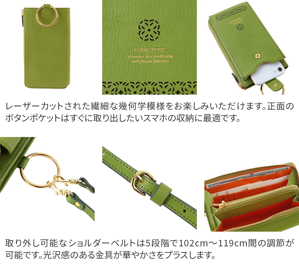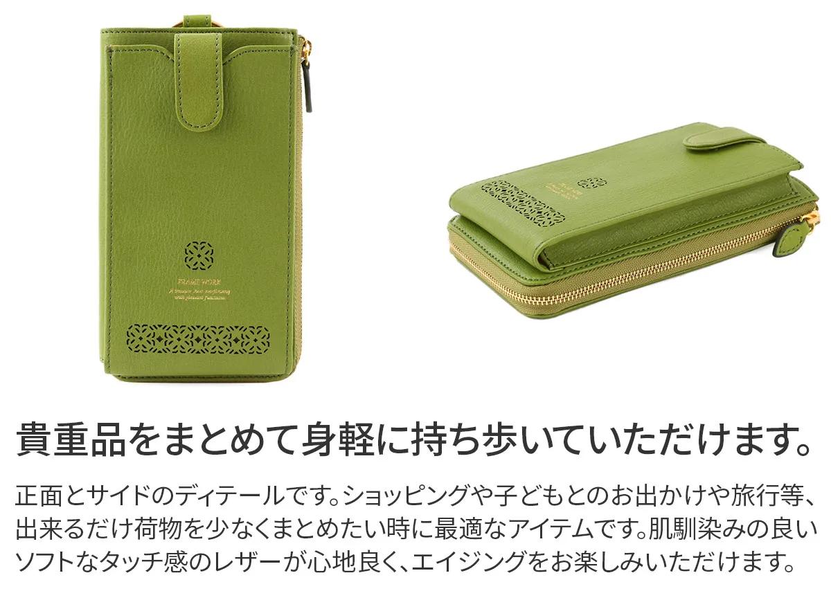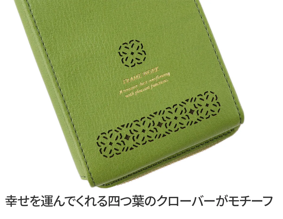 「見つけると幸運が訪れる」というジンクスのある、四つ葉のクローバーをモチーフにした繊細な幾何学模様をレーザーカットで表現しました。 ナチュラル感のある国産タンニン鞣しレザーに女性らしい植物モチーフを掛け合わせたFRAME WORKらしいキレイ目カジュアルなシリーズです。 ショルダーバッグとお財布機能が合わさったアイテムです。 電子決済がスタンダートになりつつある現代にマッチしたアイテムです。ショルダーベルトはワンタッチで取り外しが可能なので、 スタイルやシーンに合わせてアレンジをお楽しみいただけます。