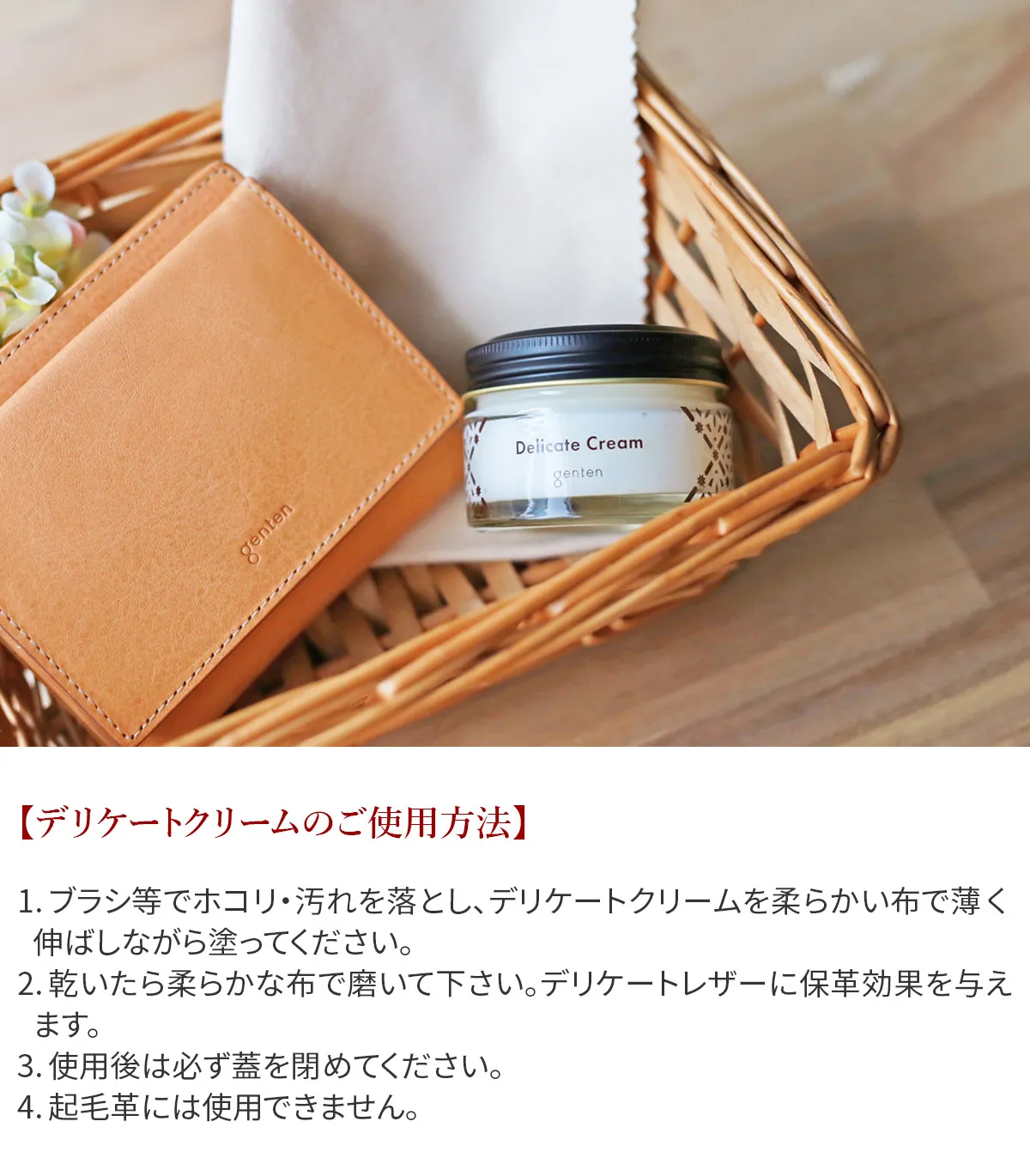 ・ブラシ等でホコリ、汚れを落とし、デリケートクリームを布で薄く伸ばしながら塗って下さい。