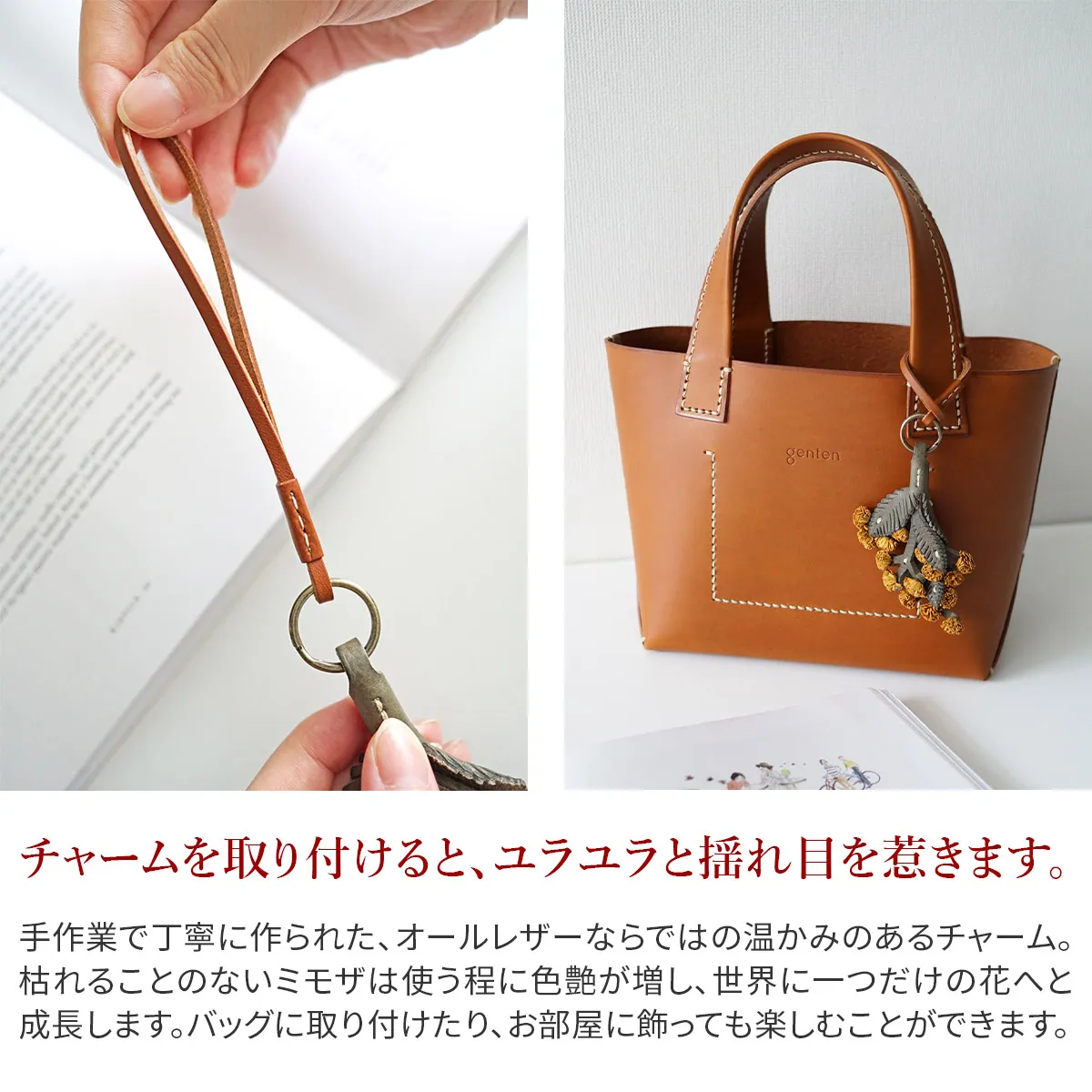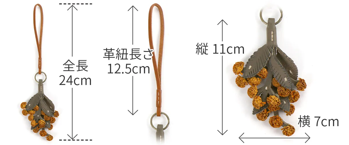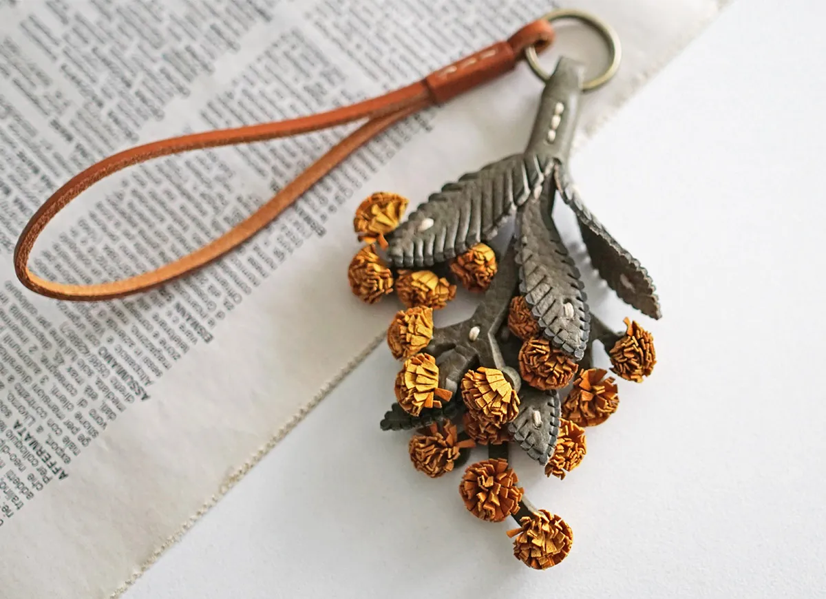 お花のプレゼントは、切り花や鉢植えが定番ですが、 「長く咲いてほしい」と感じる方も少なくありません。そこでgentenは使い続けると味わいが増すレザーチャームをお作りました。時を経るごとに美しさを増すエイジングフラワーシリーズ、『エヴァーチャーム』。ミネルヴァ素材の魅力を熟知したgentenの職人がDesign。 微細な花の細部を再現するために何度も試行錯誤を重ね、一輪一輪手作業で製作。(ミネルヴァ素材の)タンニン鞣しの革の魅力は、時を重ねるごとに艶が増し、色の深みが増すこと。長く愛用することで、その方だけの風合い、色合いになってゆきます。誕生日プレゼントに、もちろんご自分へのご褒美としても。いつまでも輝き続けるエヴァーチャームをお楽しみください。 【ミモザ】花言葉は、「感謝」や「思いやり」「友情」。3月8日の国際女性デーには女性にミモザの花を贈るという習慣があります。もとは3月8日に女性に感謝を伝えるイタリアの記念日「Festa della Donna(=女性の日)」にミモザが贈られたことが始まり。