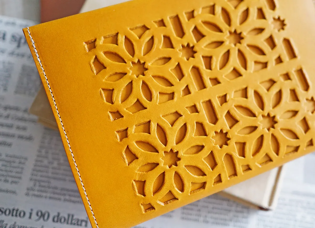 イタリア産のオイルを十分に含んだ牛革を使用しています。 表面に大胆なカットワークがあしらわれています。 カットワークのモチーフは、地中海地方沿岸に見られる伝統的な風窓からイメージされており、花と星を表しています。 表紙部分全体にカットワークをあしらった、文庫本サイズに対応したブックカバーです。 人目に付くアイテムだから、こだわりのある上質でお洒落なものを持ちたいですね。
