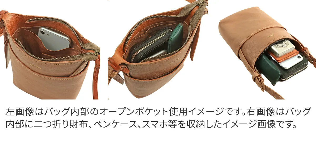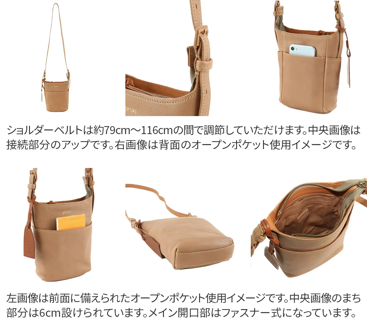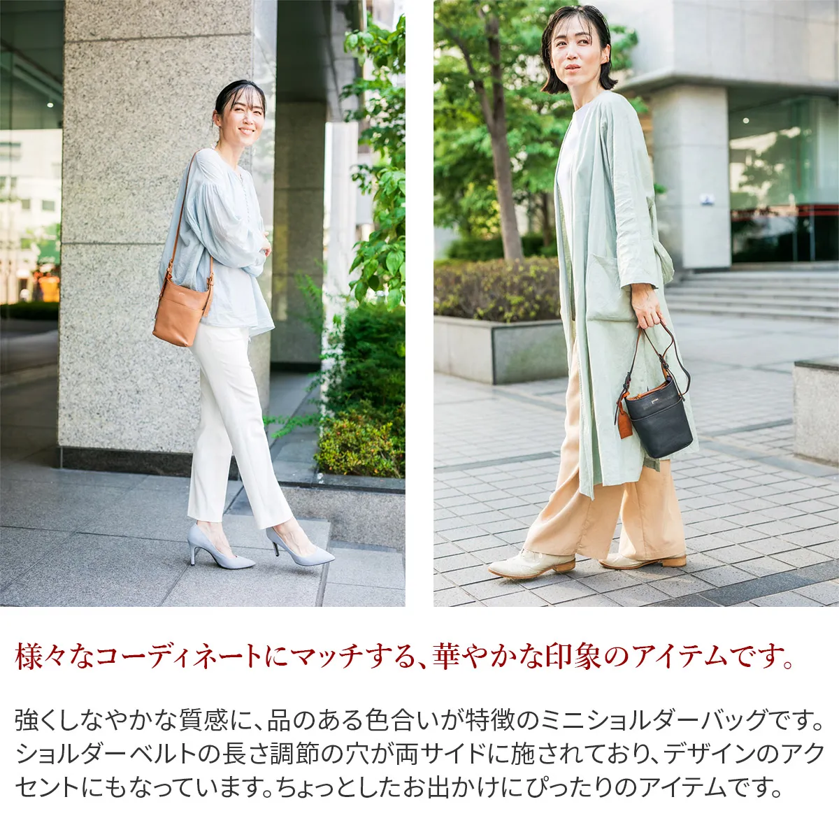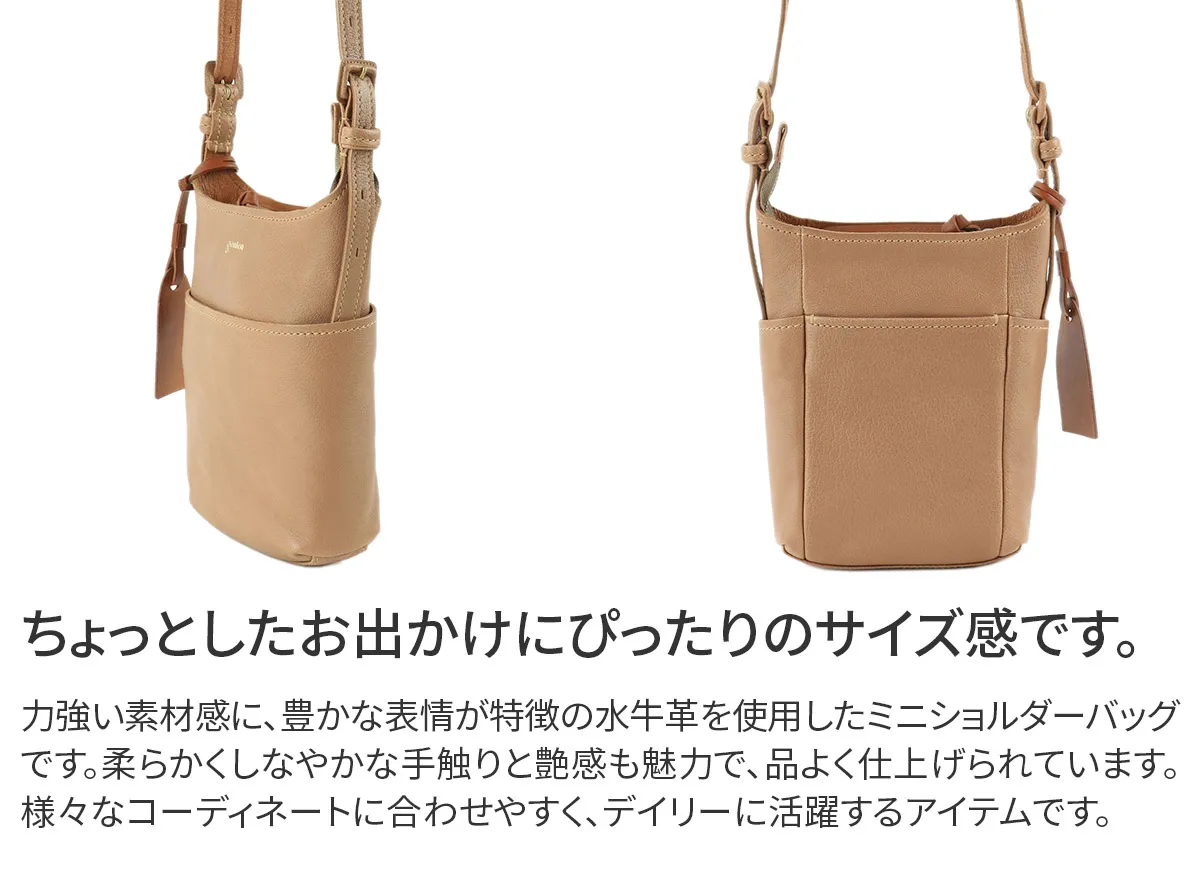 バッファローレザーを使用したベーシックシリーズ。 通常、水牛革は表面が硬いのが特徴ですが、荒々しい表情を生かしながらソフトに仕上げたオリジナル素材。前ポケットの作りは、バッファローの背中に見立て、モノを入れたときに生じるふくらみで、動物の躍動する抑揚を表現。力強い素材感が際立つように、ミシン目を控え効果的に施しました。また、全体の印象がさっぱりと品よく仕上がっているのも魅力です。比較的軽く、機能的で防犯性も加味したシリーズなので、カジュアルビジネスからウィークエンドシーンまで幅広く対応できます。 強くしなやかな質感に、品のある色合いが特徴のミニショルダーバッグです。ショルダーベルトの長さ調節の穴が両サイドに施されており、デザインのアクセントにもなっています。ちょっとしたお出かけにぴったりのアイテムです。