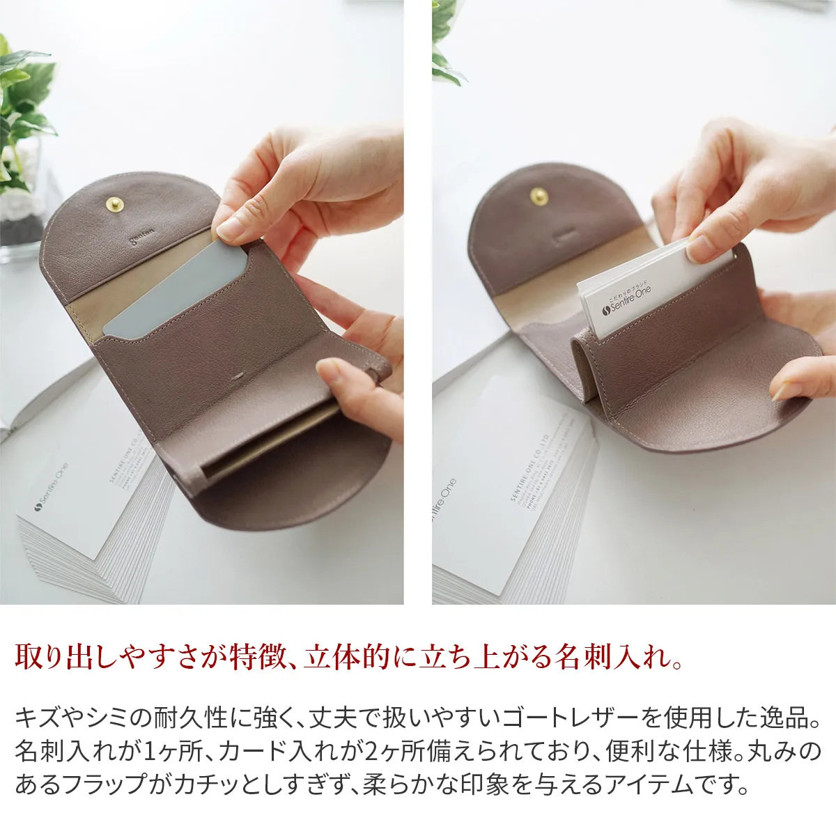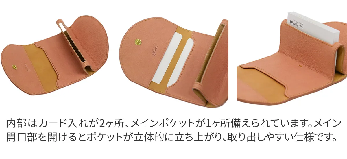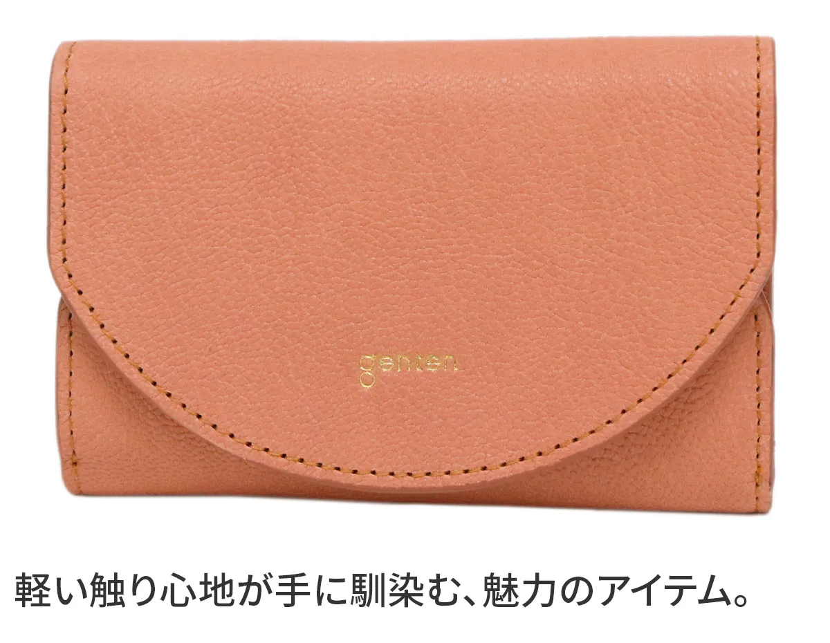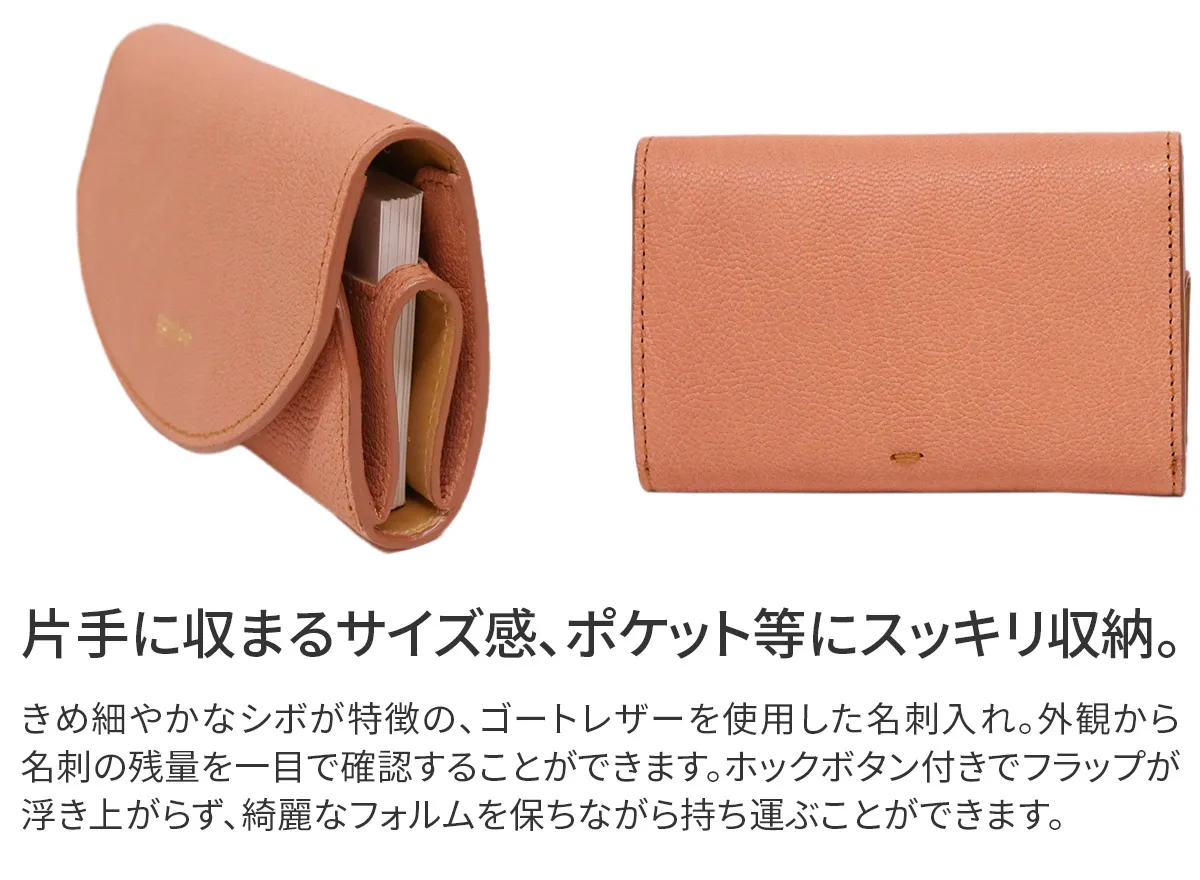 シンプルで、軽快に仕上げたカジュアルなゴート(山羊革)のイメージをくつがえすシリーズ。インド原皮のゴートは、パキスタン原皮に比べてシボが四角く立っているのが特徴です。(パキスタン原皮は流れるようなシボ)その中でも小判のゴートを使用。きめ細やかな肌目はカジュアルになりすぎず、革の地艶の輝きを出し、瑞々しく上品な印象になるよう仕上げています。 <素材の特徴・メリット>インド原皮のゴートをLWGゴールドレートを獲得したインドのタンナーで鞣しています。小物だからこそ版が取れる小判のゴートを使用しています。キットまではいきませんが、シボが四角くきめ細やかで、銀面が強いのも特徴です。内装はインドでピット鞣しをしたカーフを使用。 丸みのある愛らしいフラップに、箔押しのブランドロゴが上品で魅力的。フラップを開けると、名刺入れが立体的に立ち上がり、ストレスなく取り出しが可能です。両サイドから名刺の残量も確認ができる便利な仕様です。